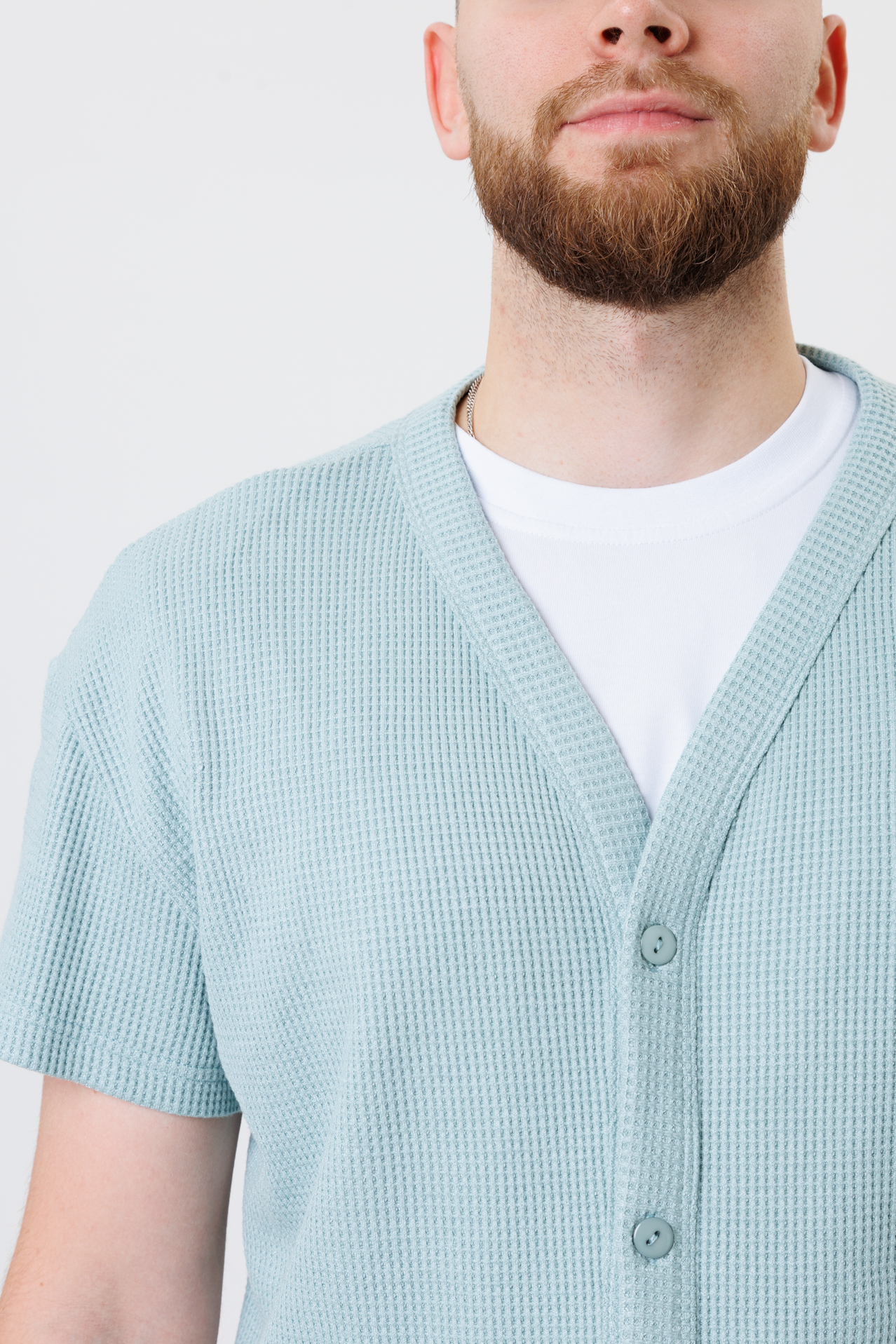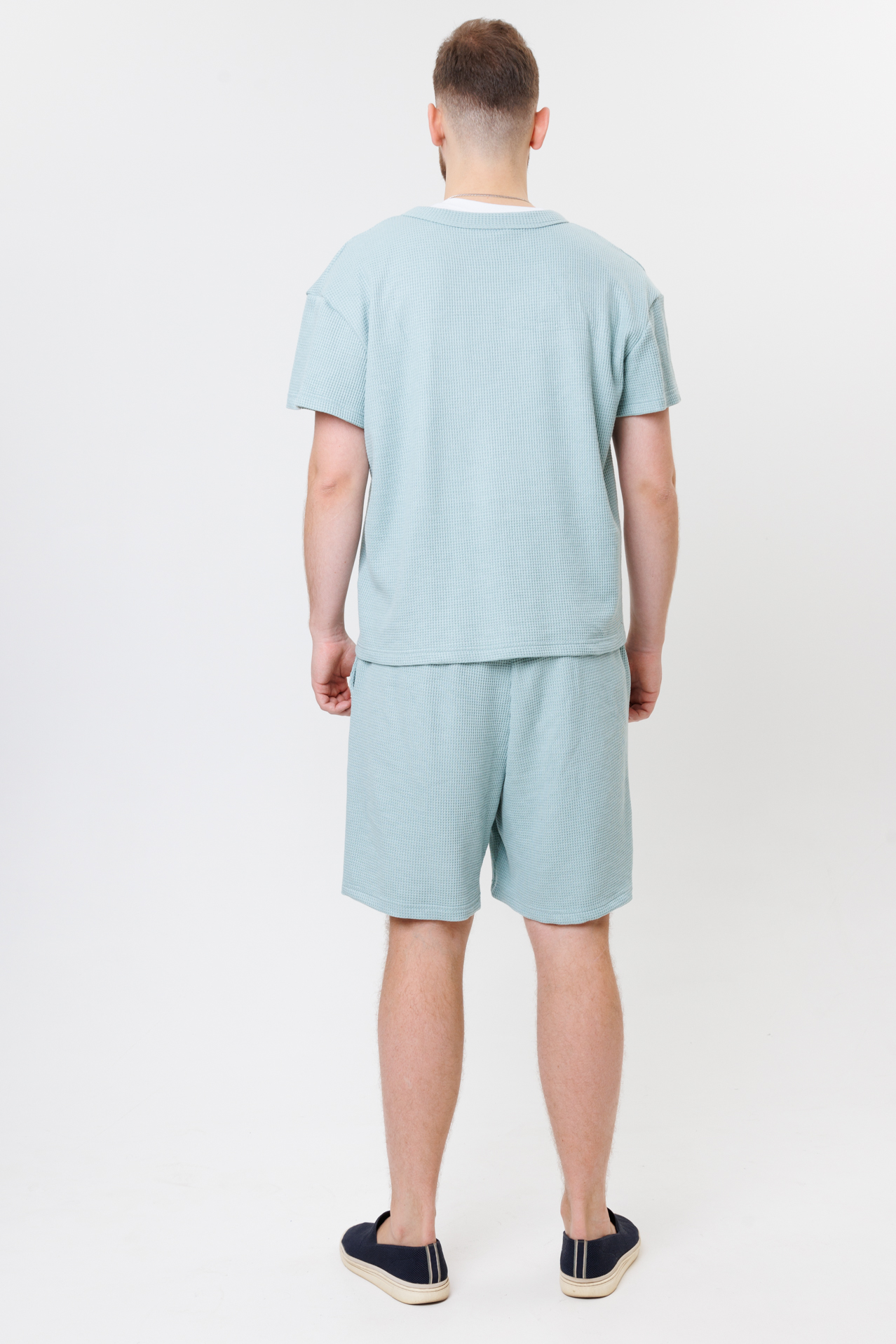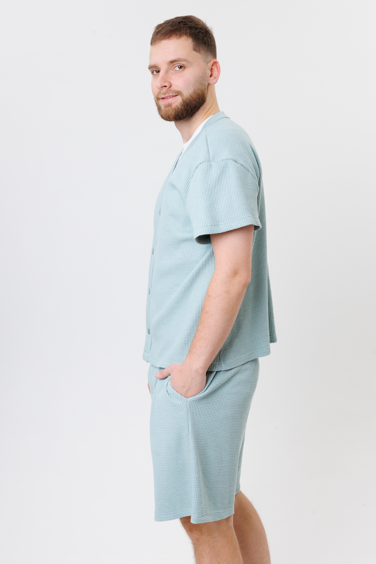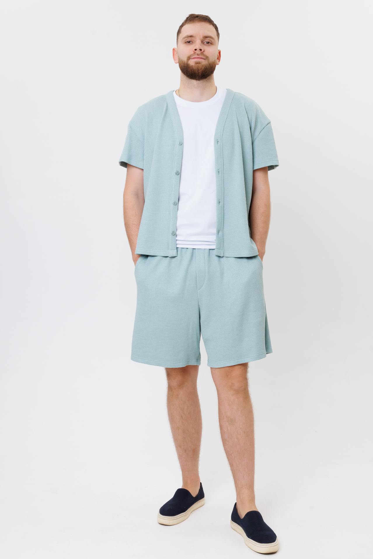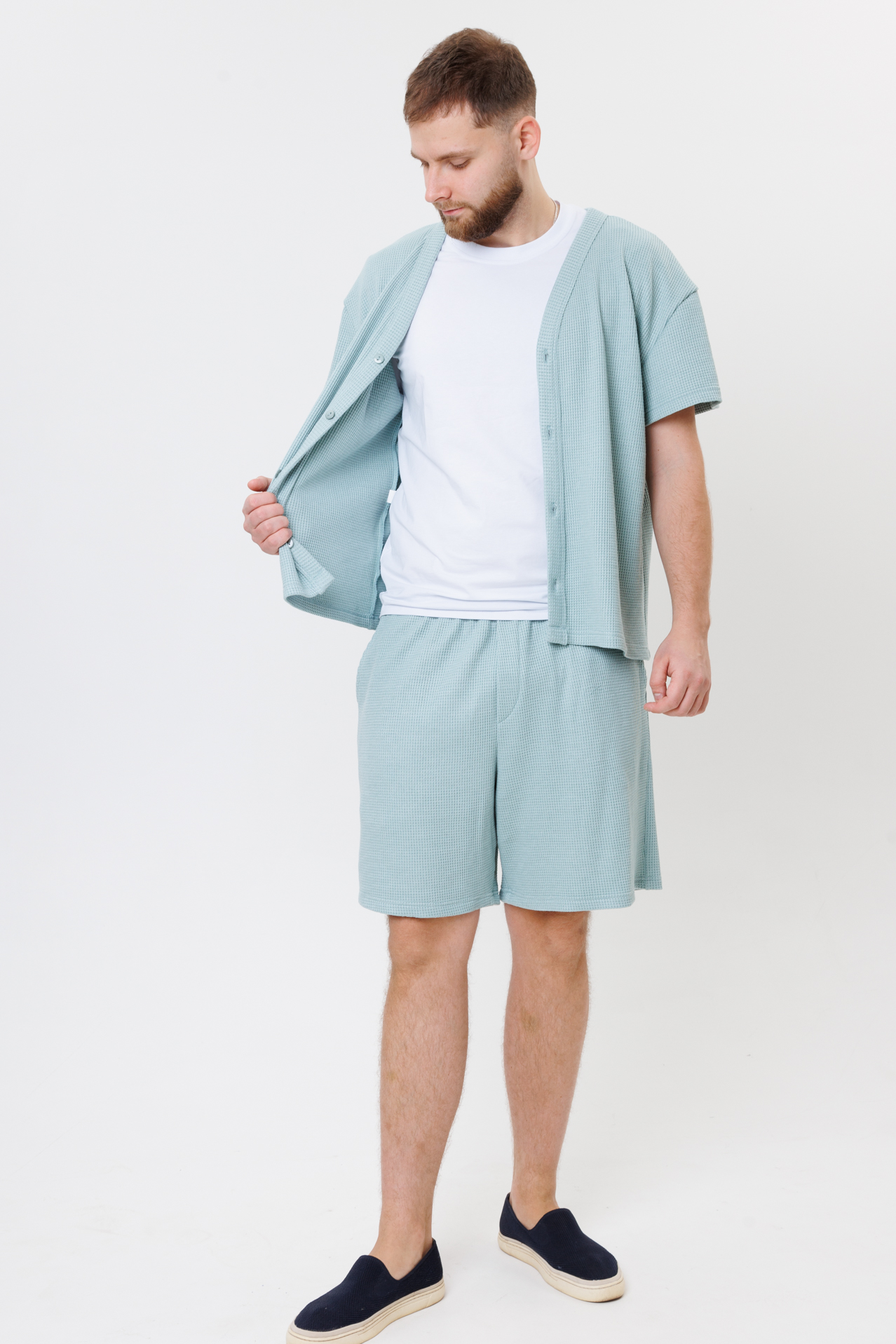 Комплект состоит из рубашки и шорт. Свободная рубашка на пуговицах с V-образным вырезом. Шорты на эластичной резинке. Комплект можно использовать для стильных расслабленных образов как на улице так и дома.