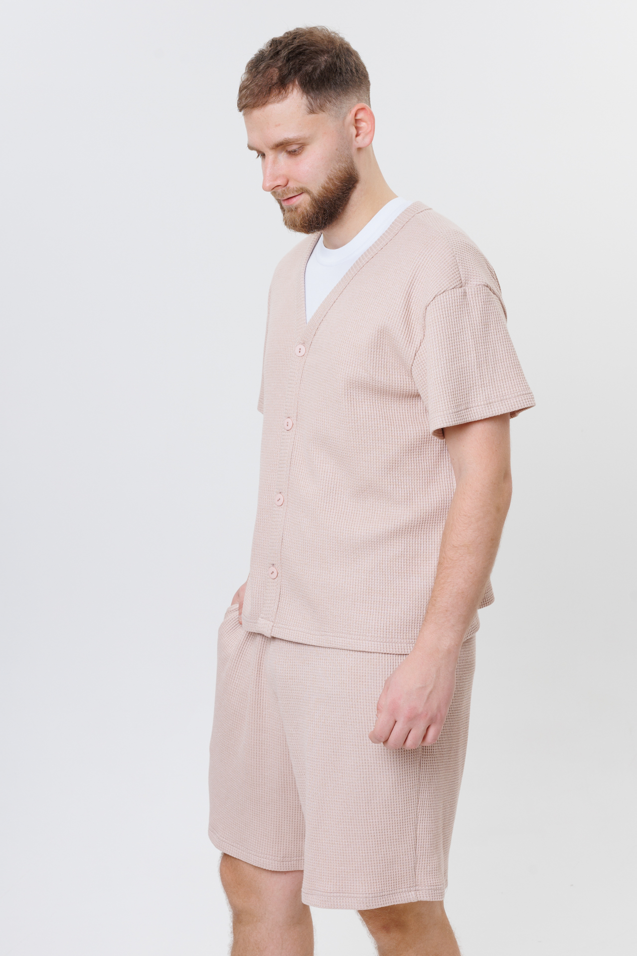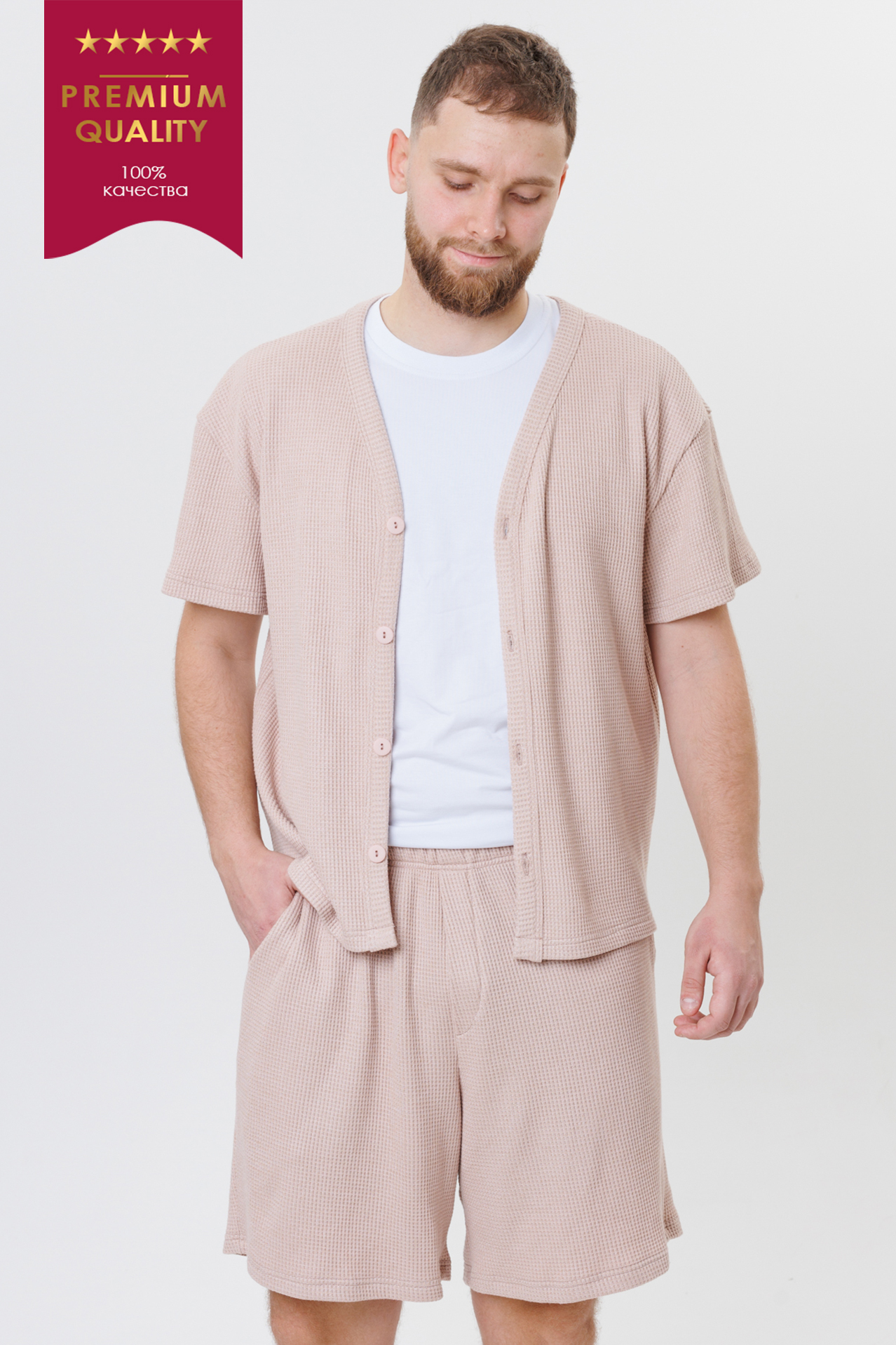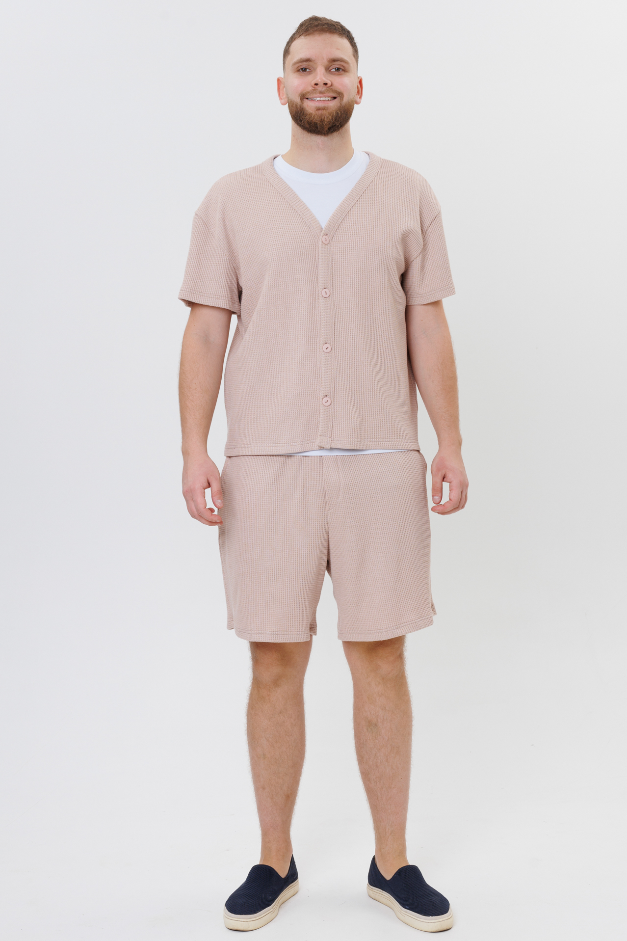 Комплект состоит из рубашки и шорт. Свободная рубашка на пуговицах с V-образным вырезом. Шорты на эластичной резинке. Комплект можно использовать для стильных расслабленных образов как на улице так и дома.