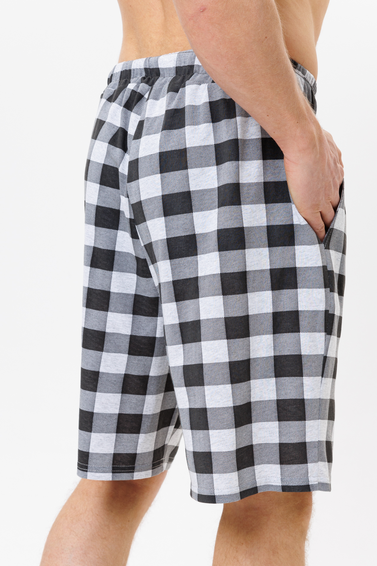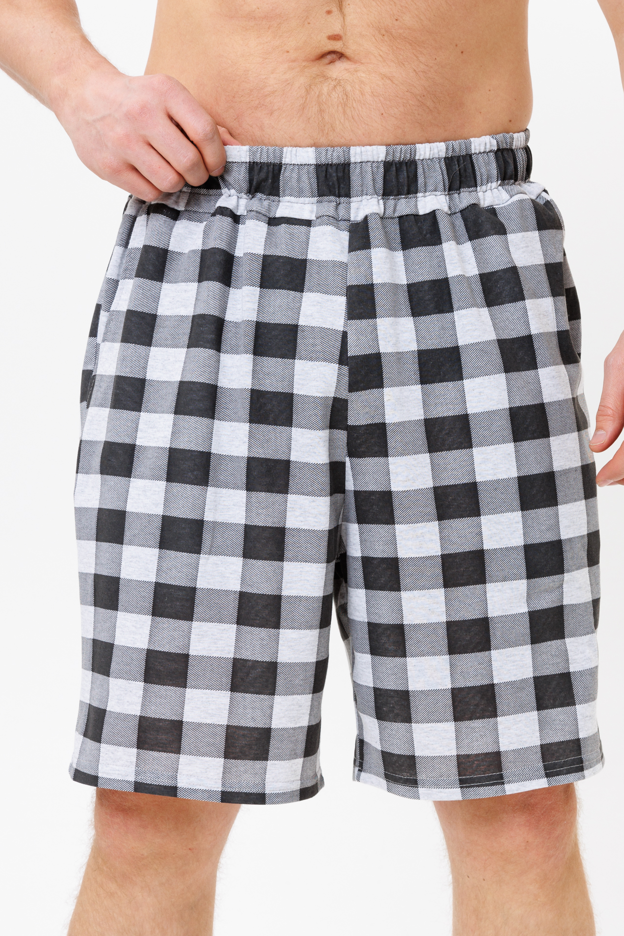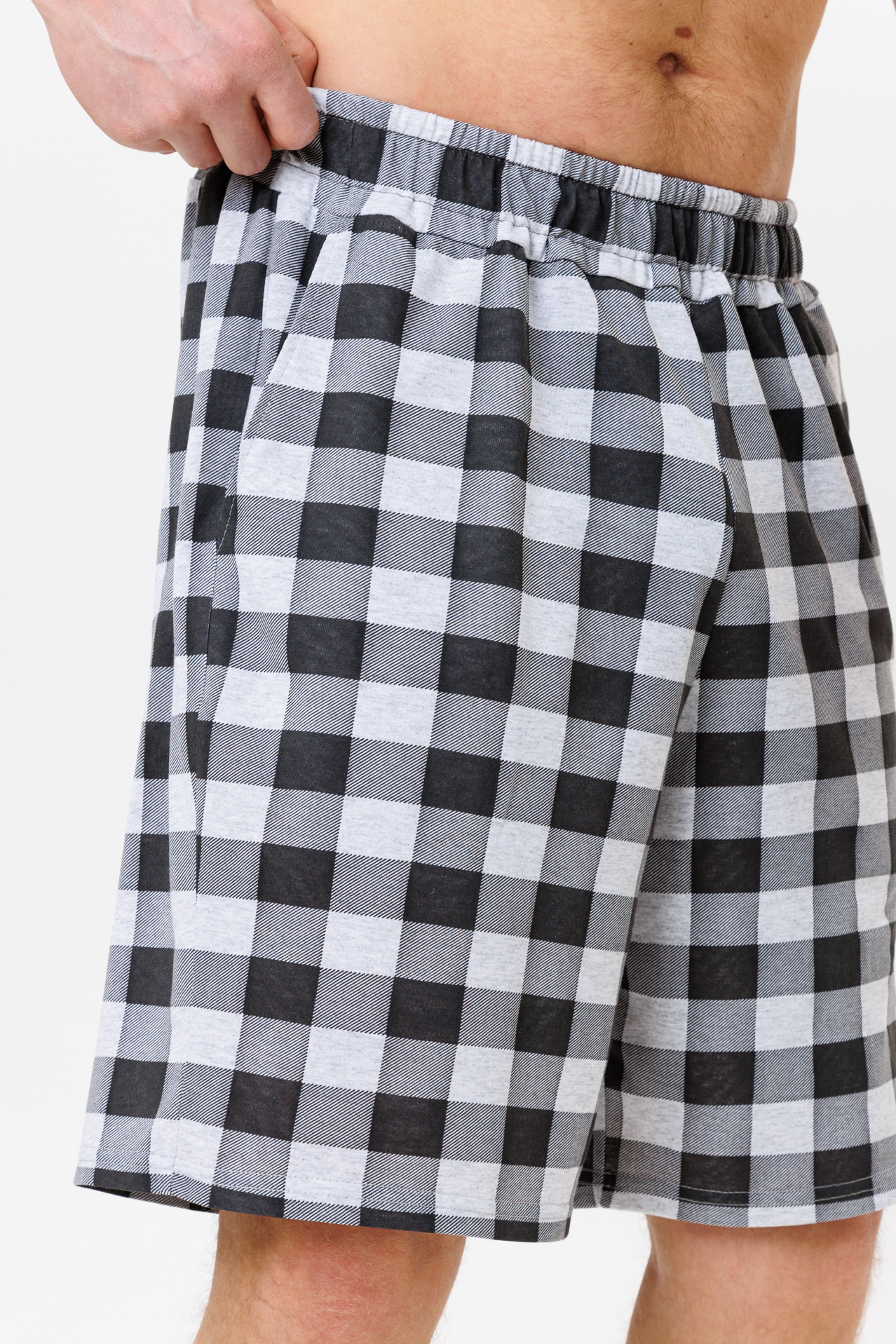 Пояс шорт выполнен на поясной машине, что не позволяет резинке деформироваться и скручиваться внутри пояса.