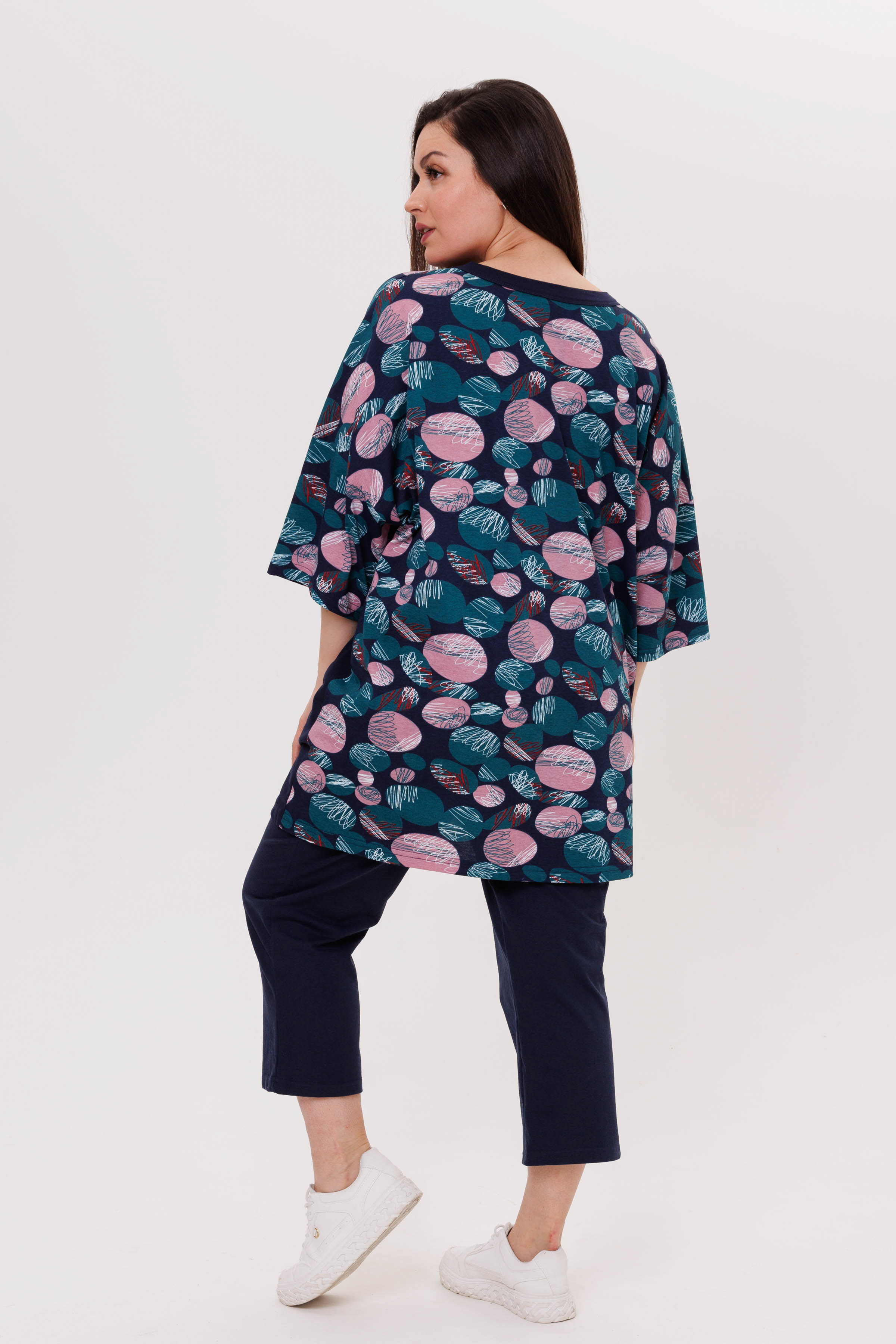 Туника прямого силуэта. По линии груди в шве стачивания кокетки и нижней части полочки располагаются клапаны "ложных" карманов, выполняющих декоративную роль. Рукав втачной, спущенное плечо, длина ниже локтя. На полочке туники выполнены регланы с внутренними глубокими и удобными карманами. Горловина обработана обтачками.- Бриджи слегка заужены. Пояс бридж цельнокроенный на резинке