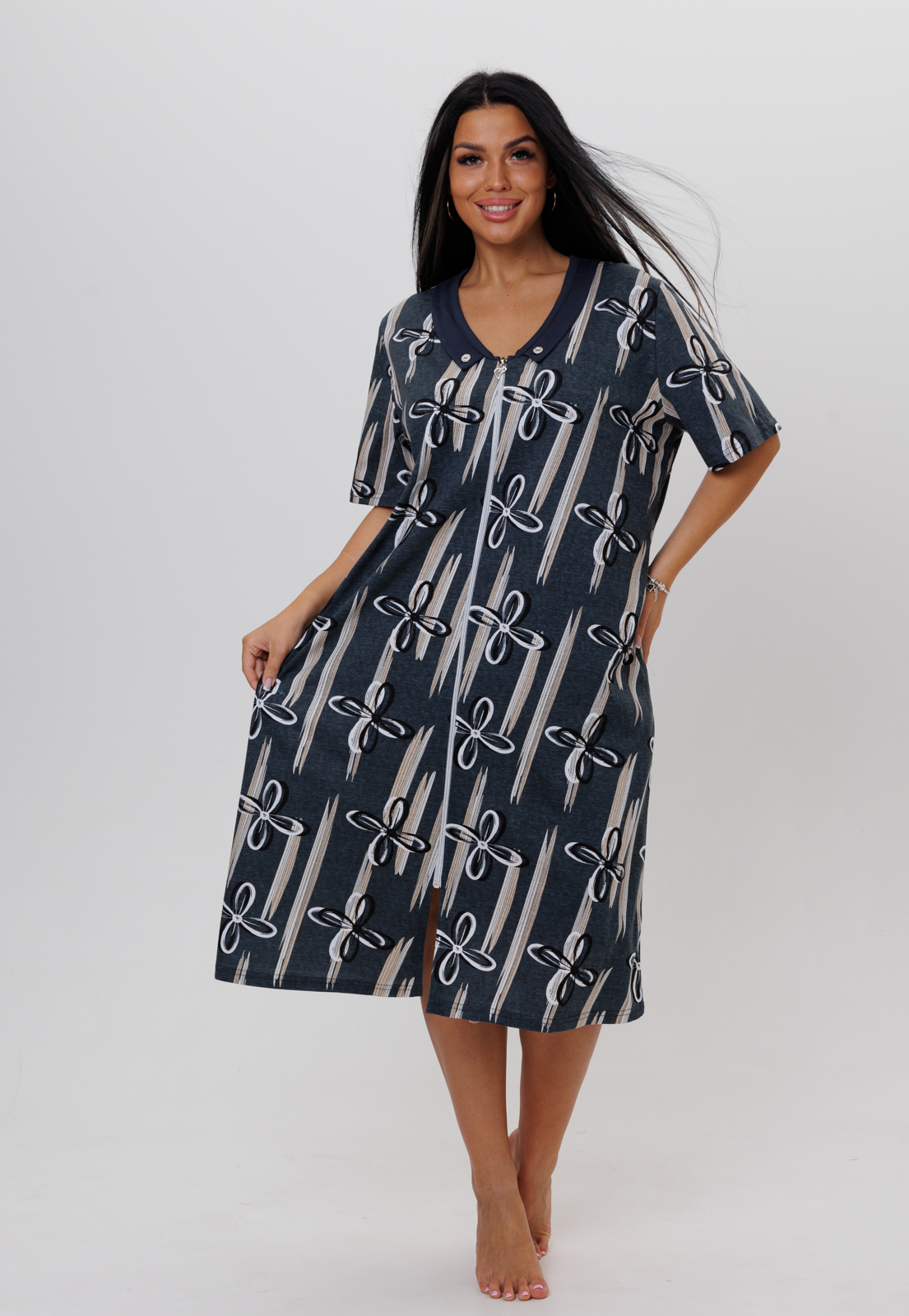Халат из кулирки больших размеров, на молнии. Длина ниже колена, короткий рукав.Зона воротника выполнена из контрастного материала, украшена пуговицами