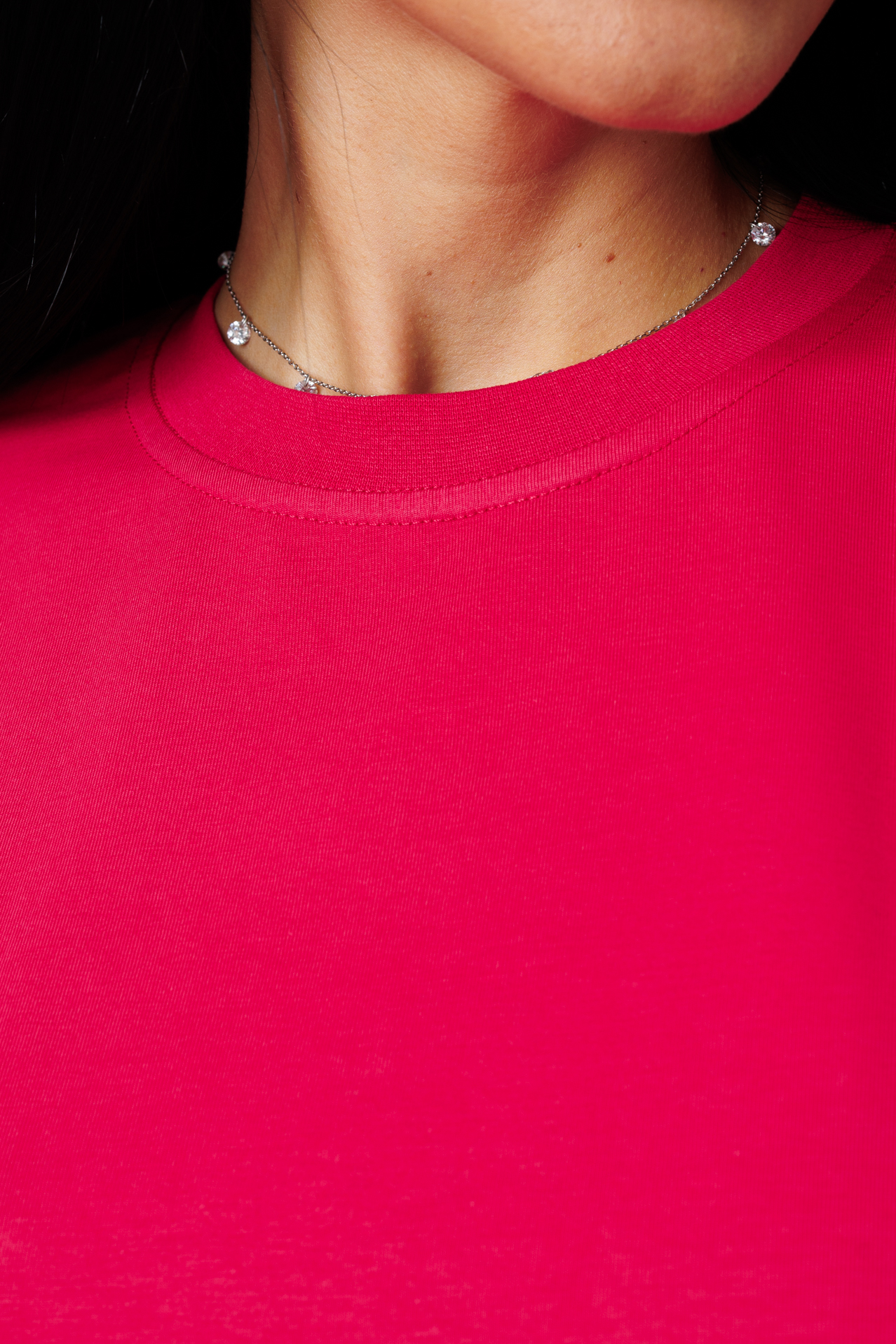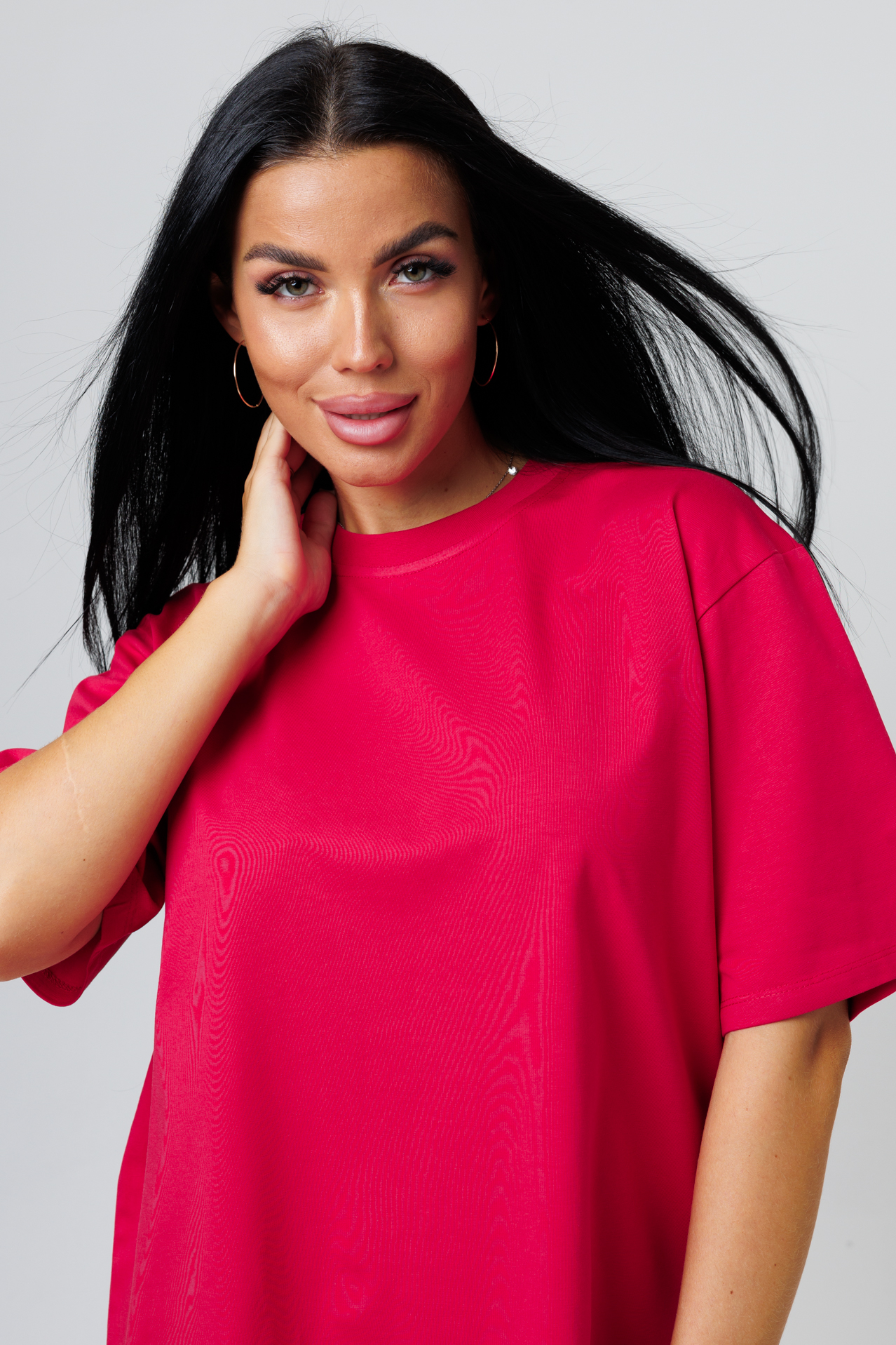Однотонная широкая трикотажная модель прямого кроя, со спущенным плечом отлично сочетается с другими вещами из гардероба, с ней можно с легкостью собрать молодежный интересный образ.