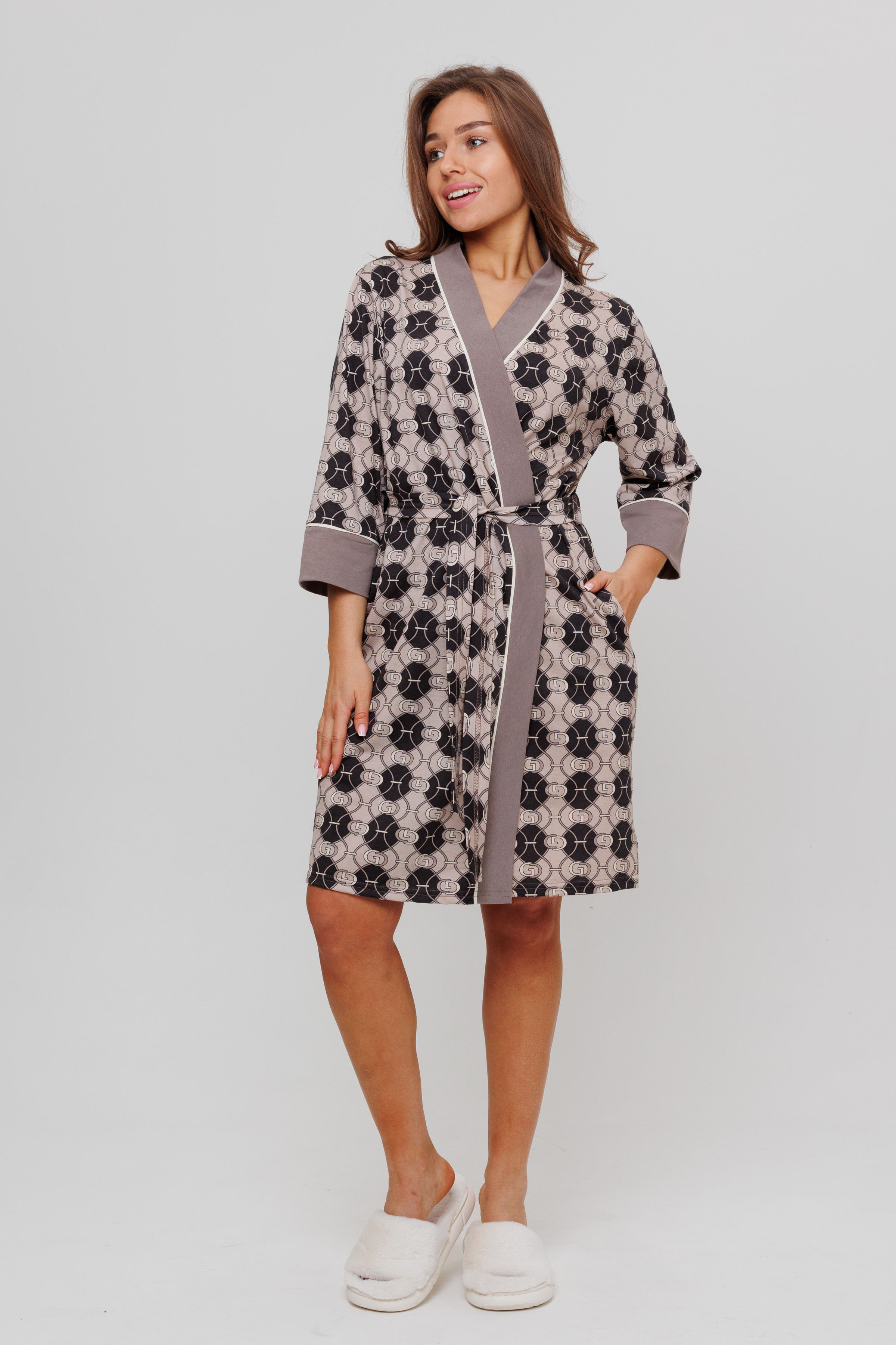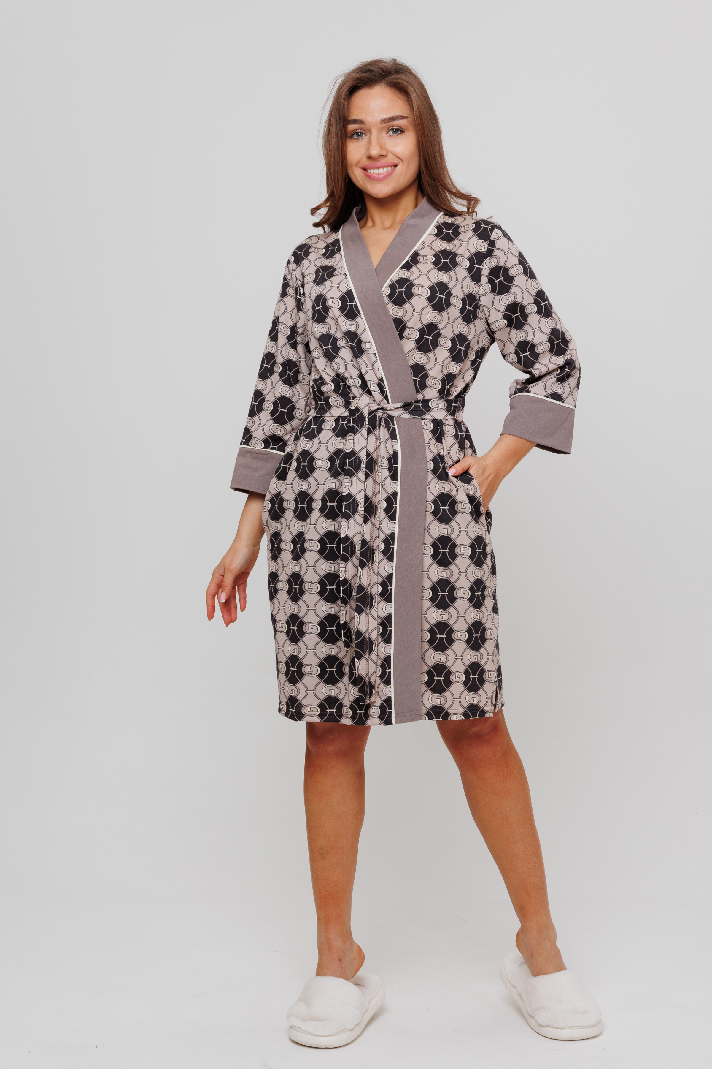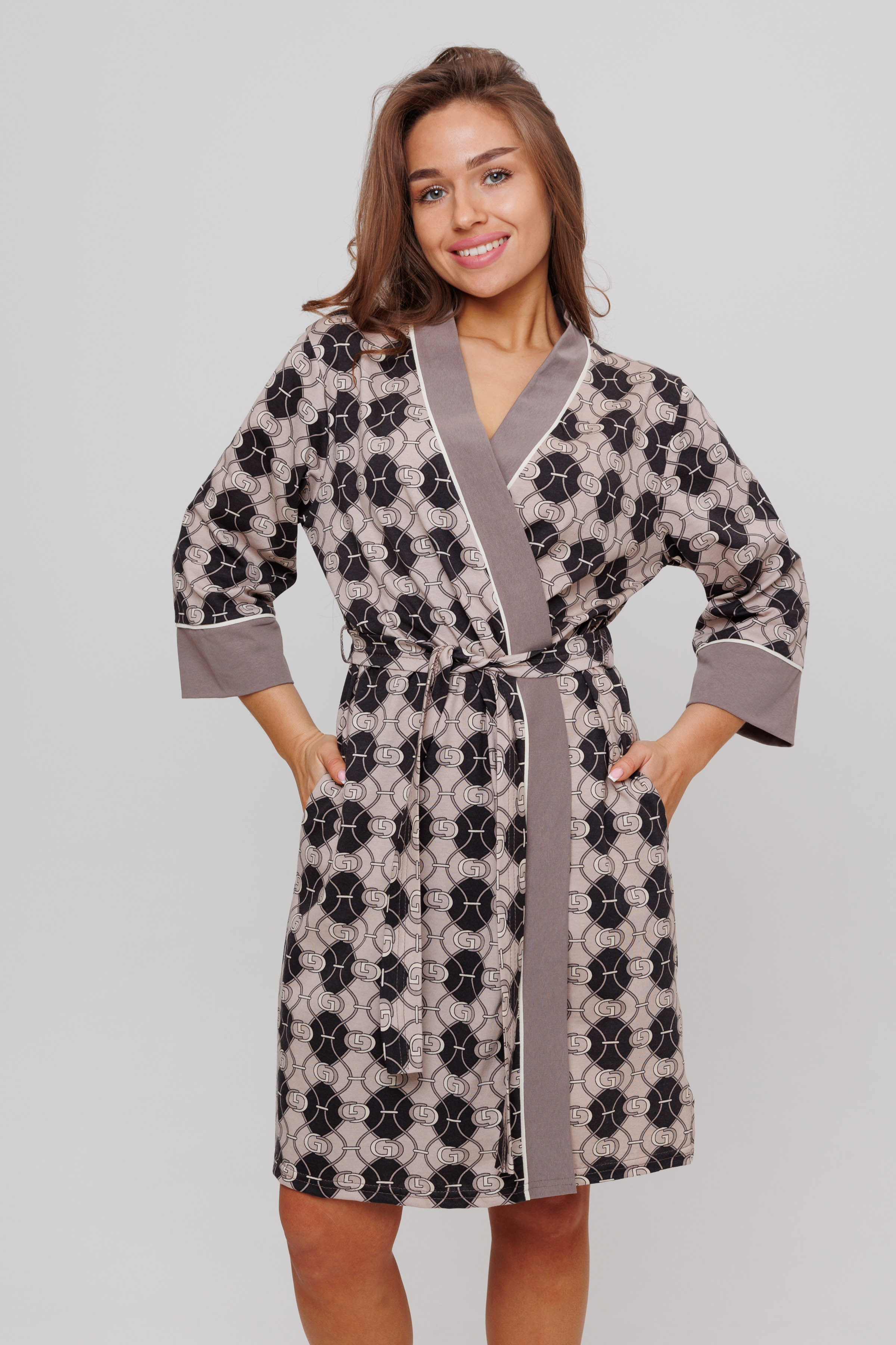 Халат запашной, обработанный планкой из отделочной ткани, задекорированный атласным кантом. В боковых швах халата имеются карманы. Длина рукав вместе с манжетом - 3/4. Для удобства подвязывания пояса имеются шлевки.