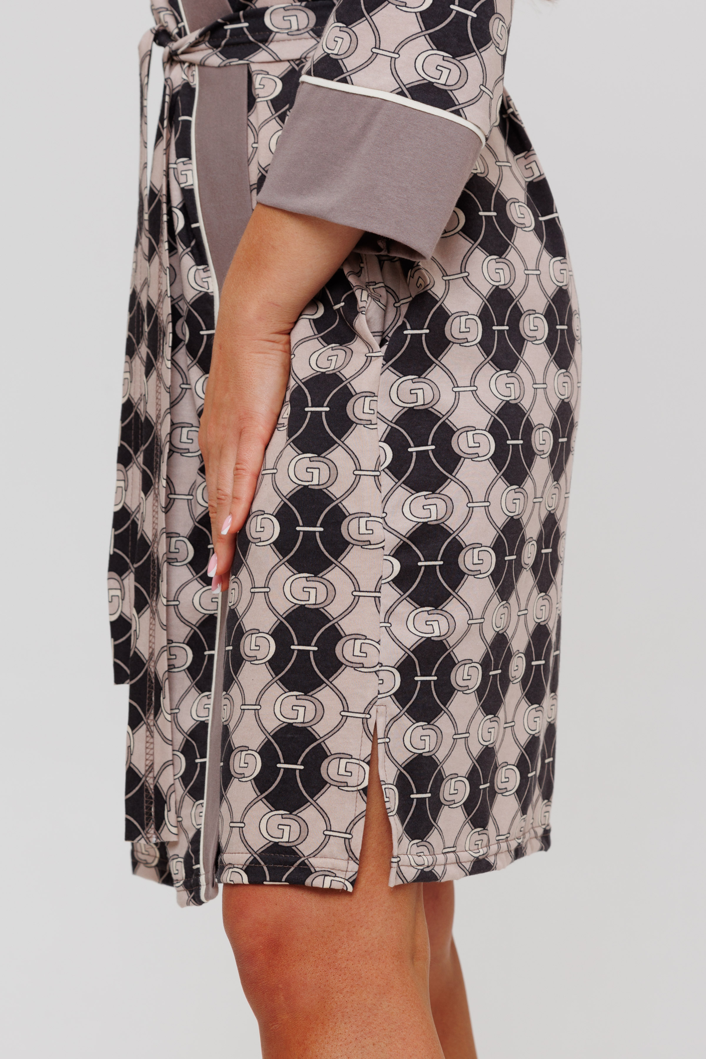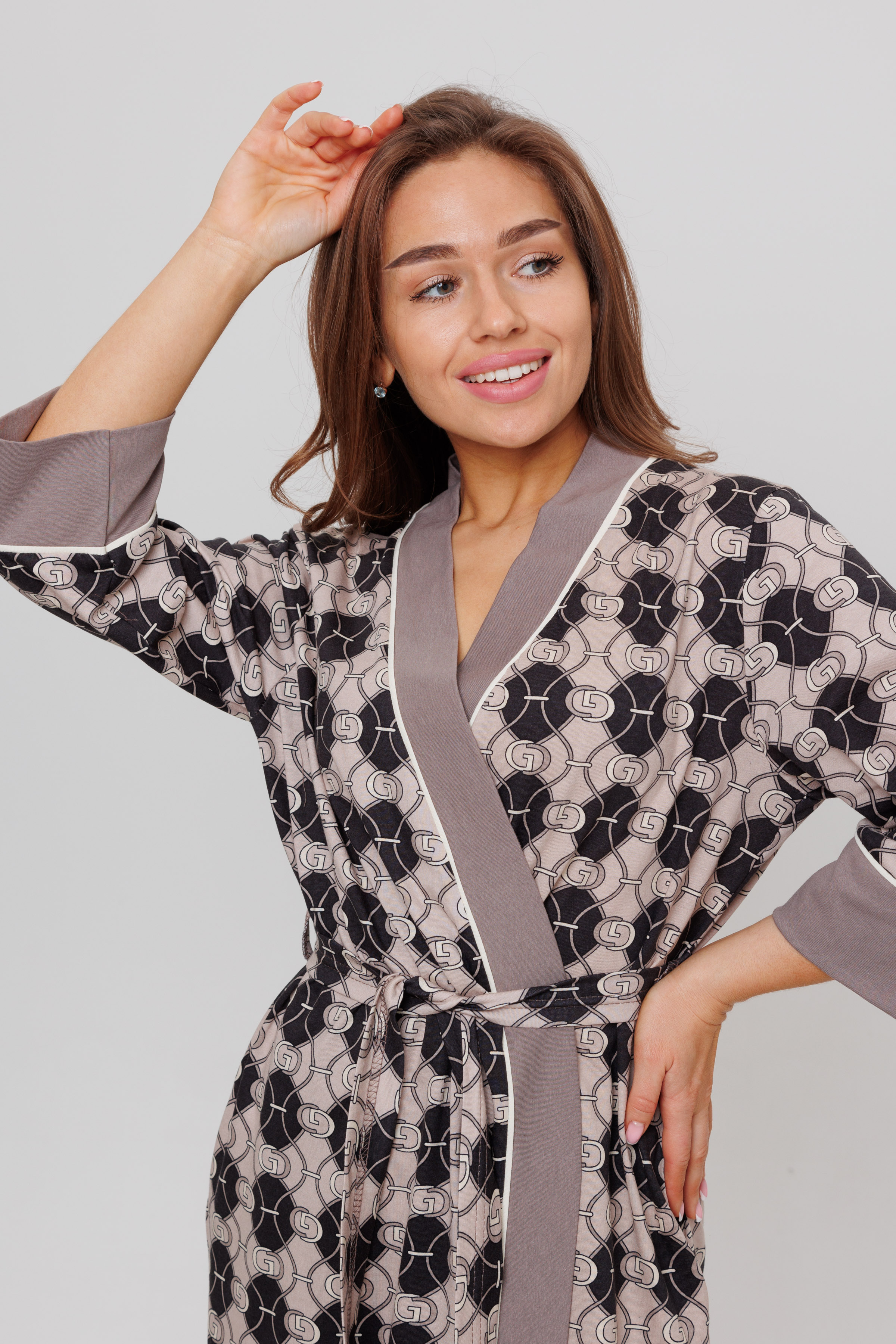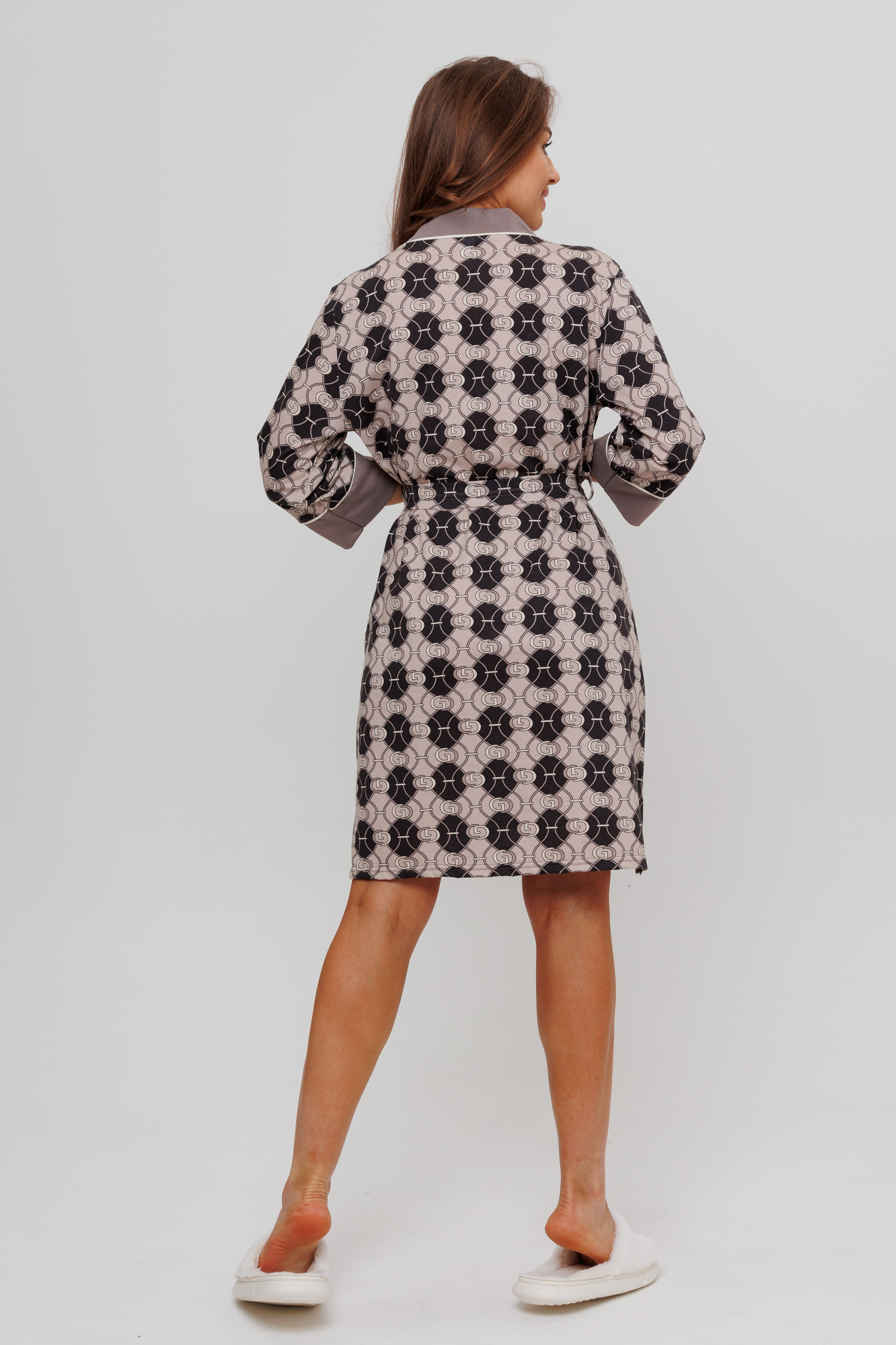Халат запашной, обработанный планкой из отделочной ткани, задекорированный атласным кантом. В боковых швах халата имеются карманы. Длина рукав вместе с манжетом - 3/4. Для удобства подвязывания пояса имеются шлевки.