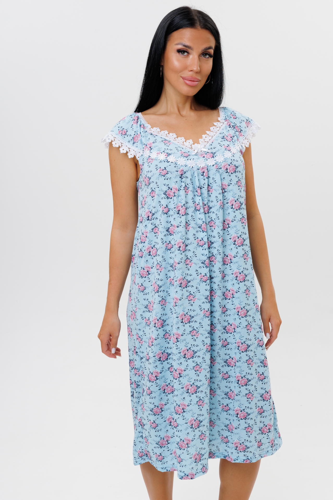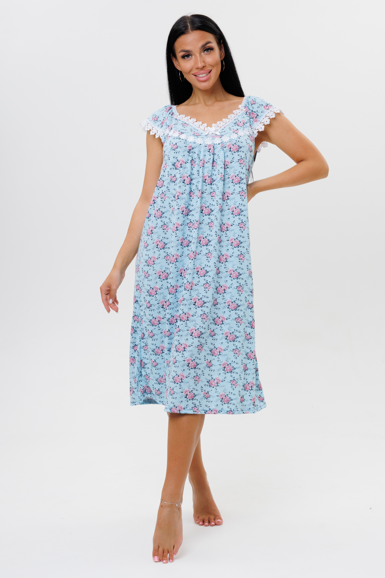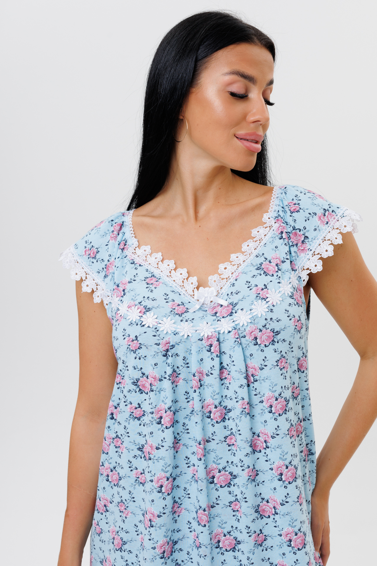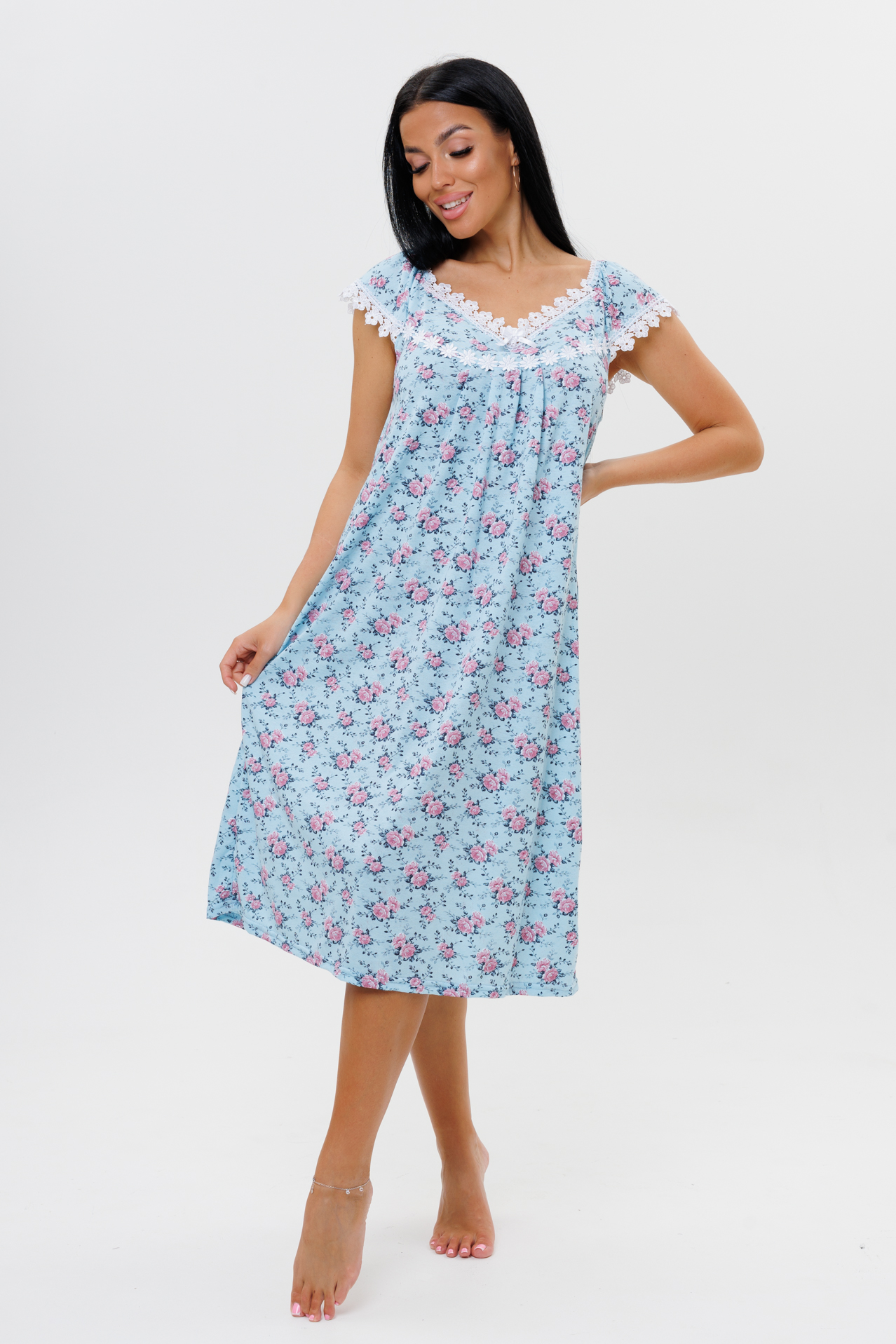 Оригинальная ночная сорочка выполнена из кулирки. Женственность этой сорочке придает вырез декольте, кокетка на груди со складками, отделанные кружевом.
