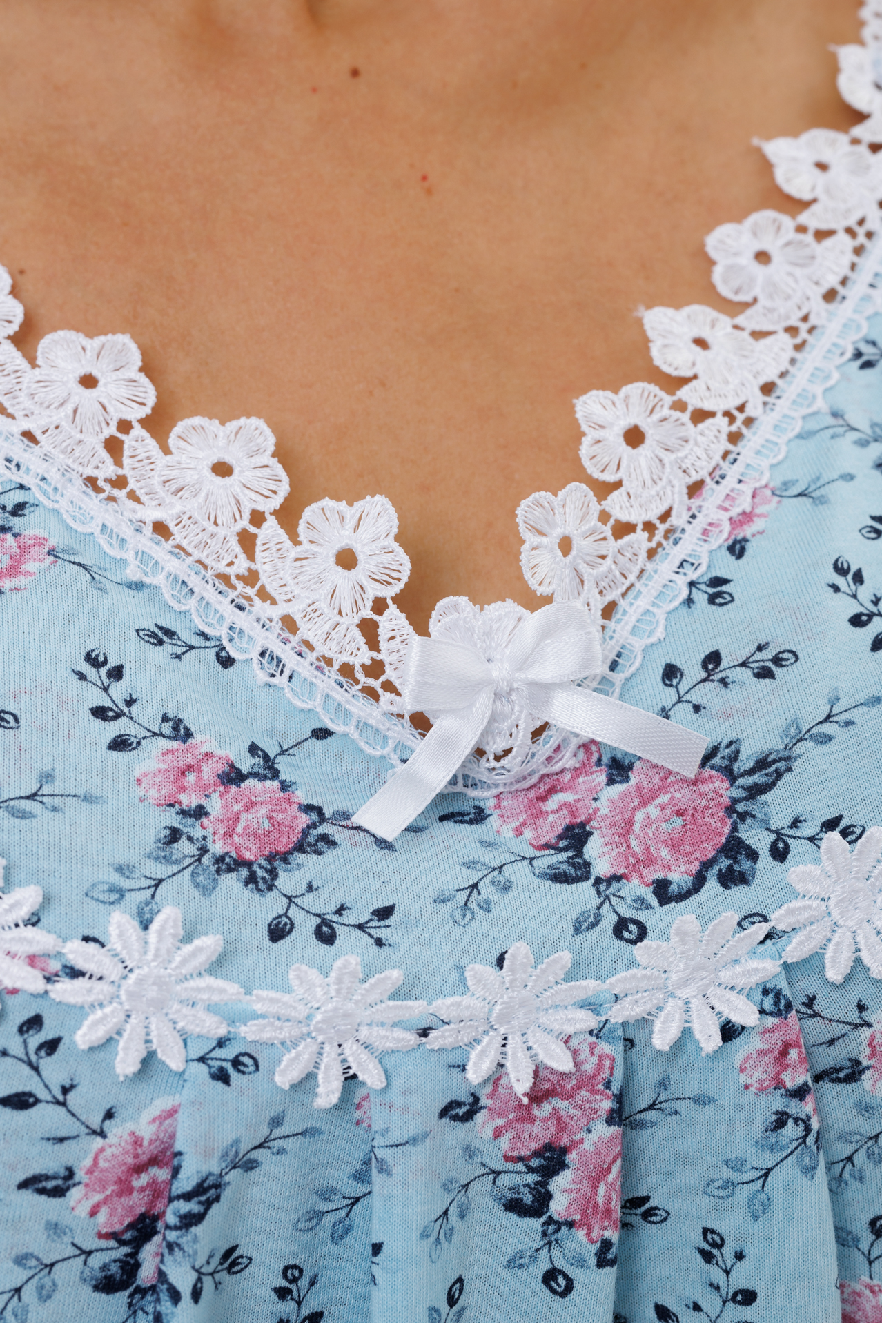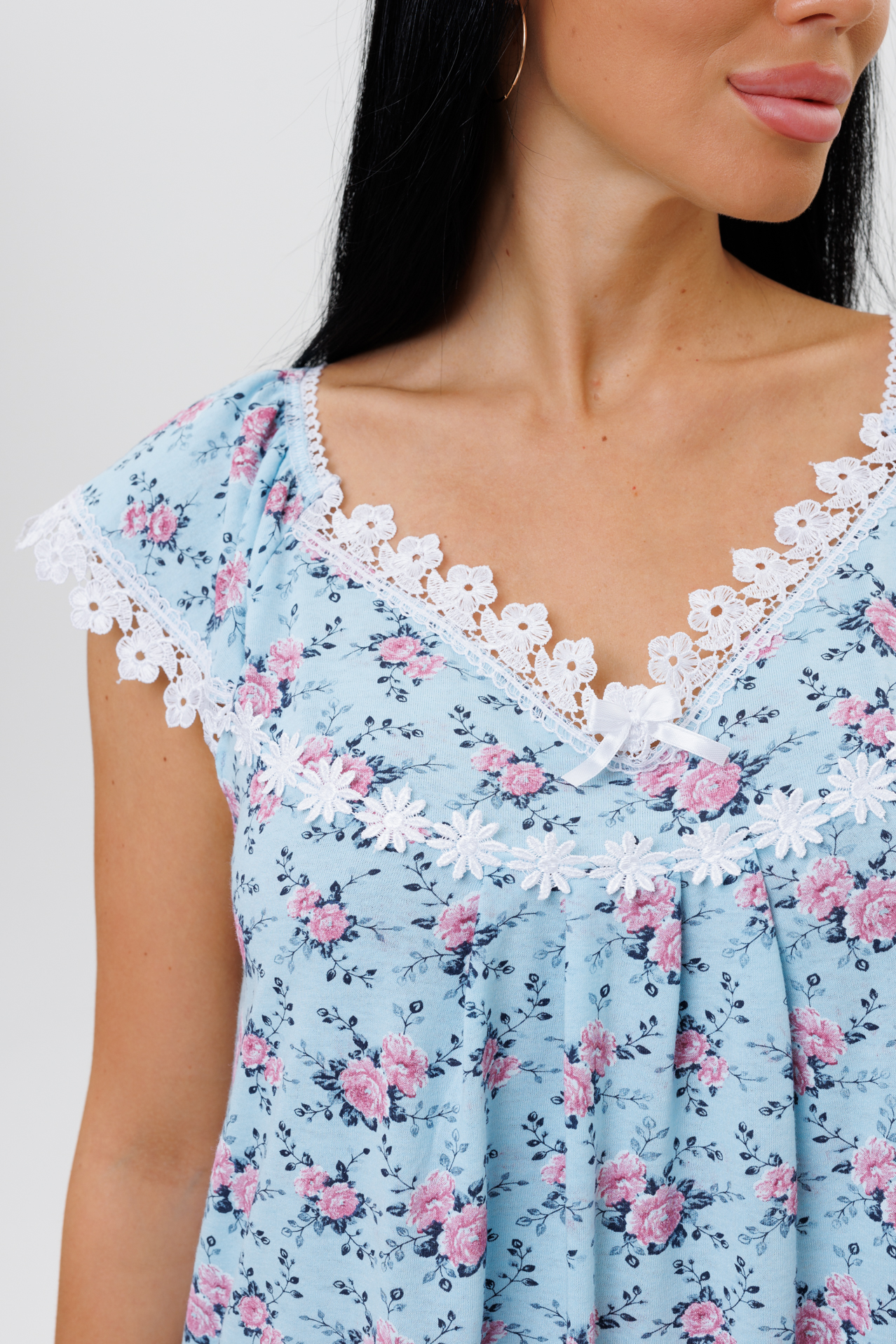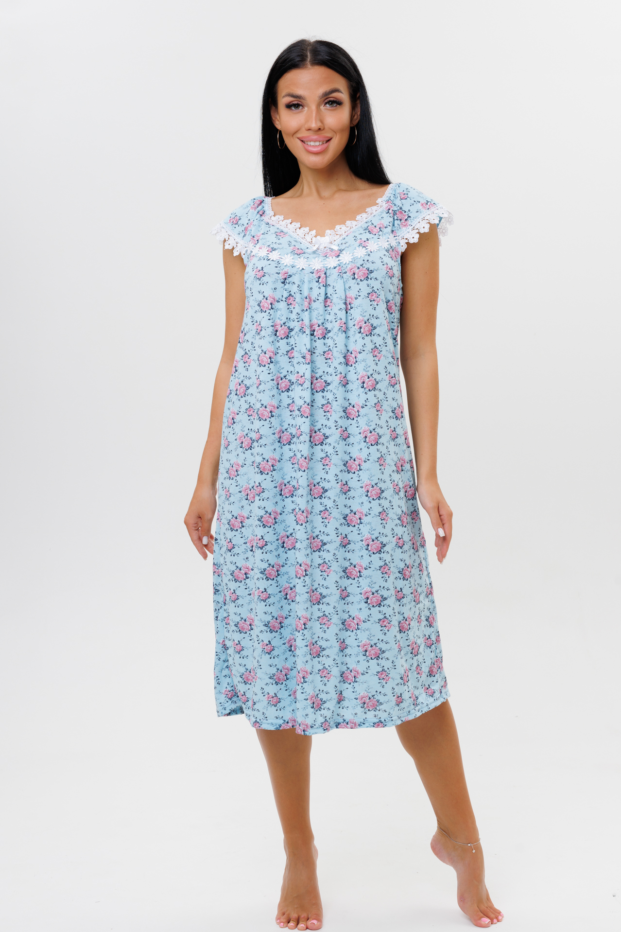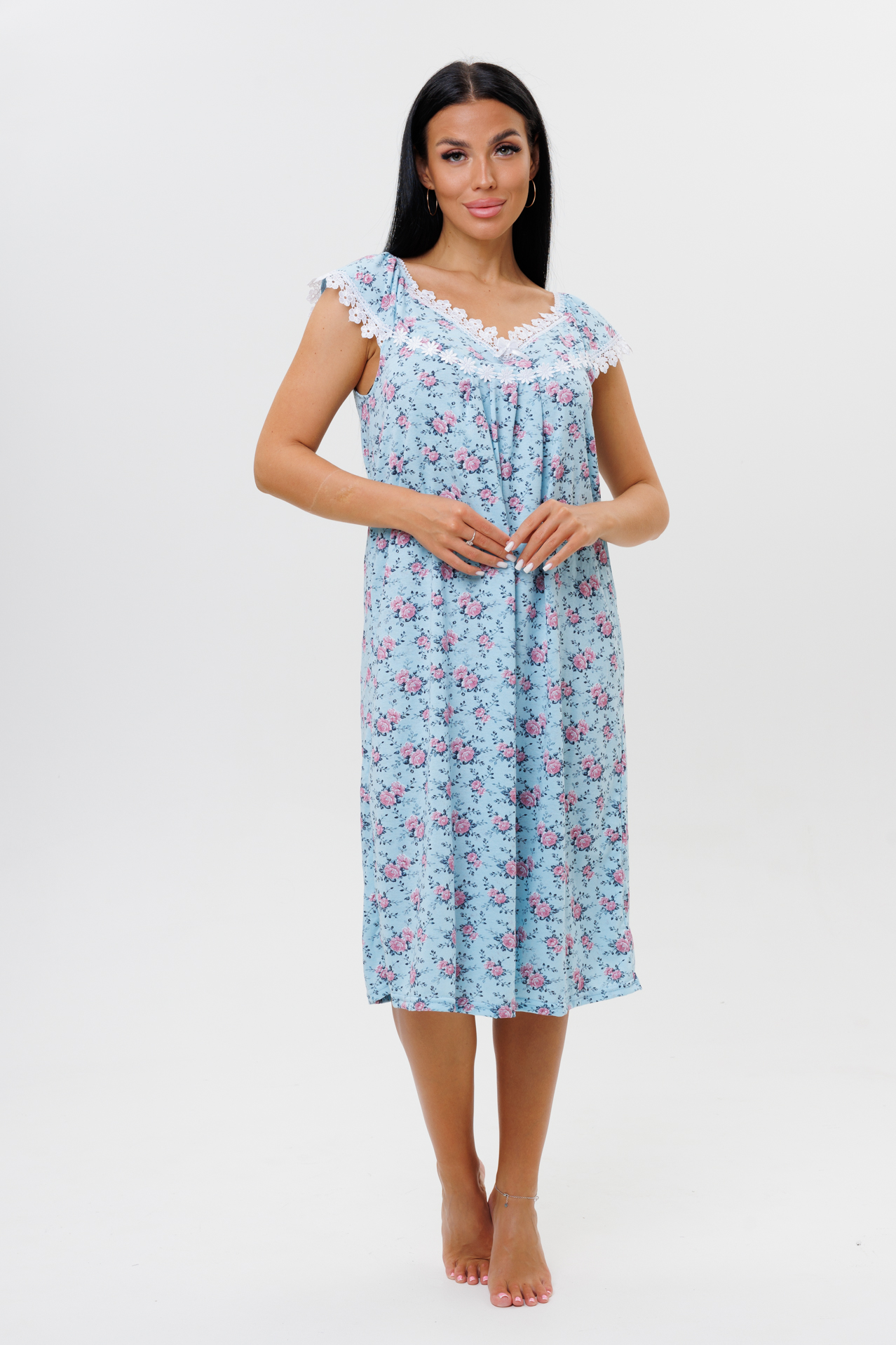 Оригинальная ночная сорочка выполнена из кулирки. Женственность этой сорочке придает вырез декольте, кокетка на груди со складками, отделанные кружевом.
