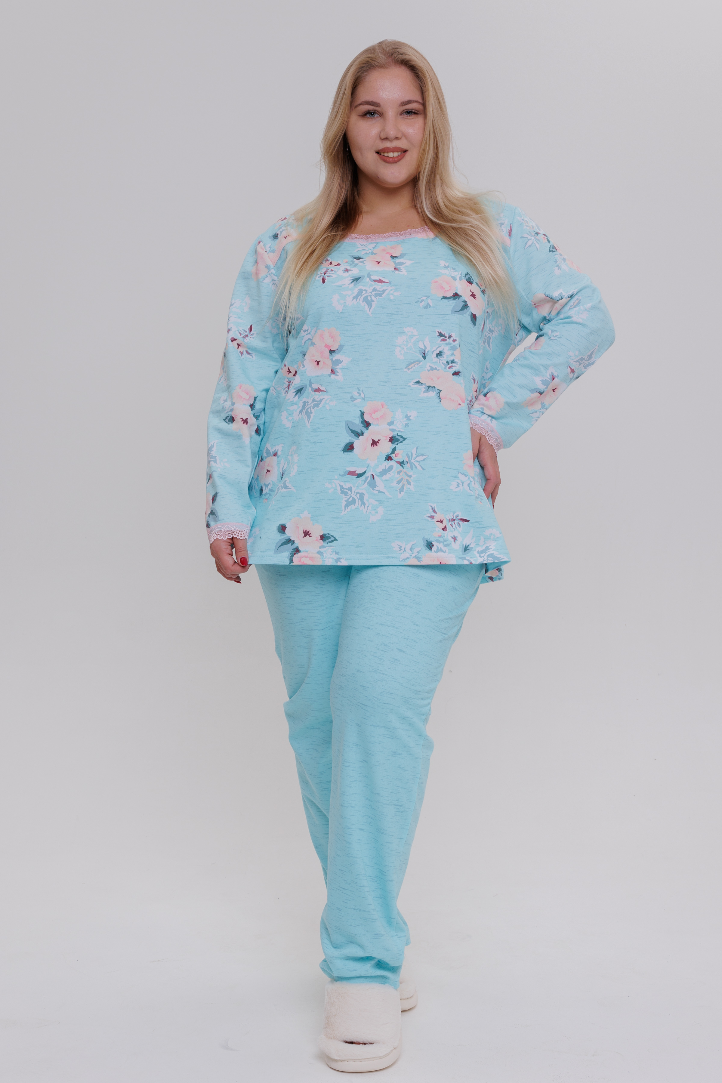 Женская пижама из футера с начесом состоит из жакета и брюк.