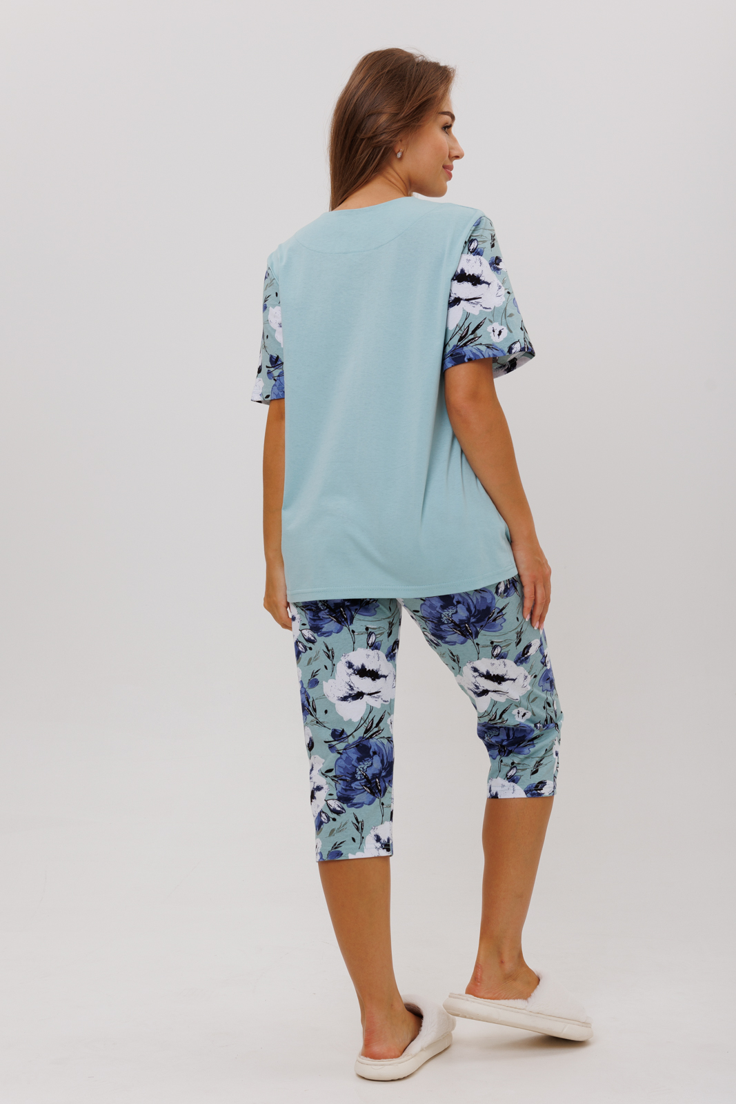 Пижама выполнена из тканей-компаньонов: однотонного полотна и полотна с очень женственным цветочным принтом.