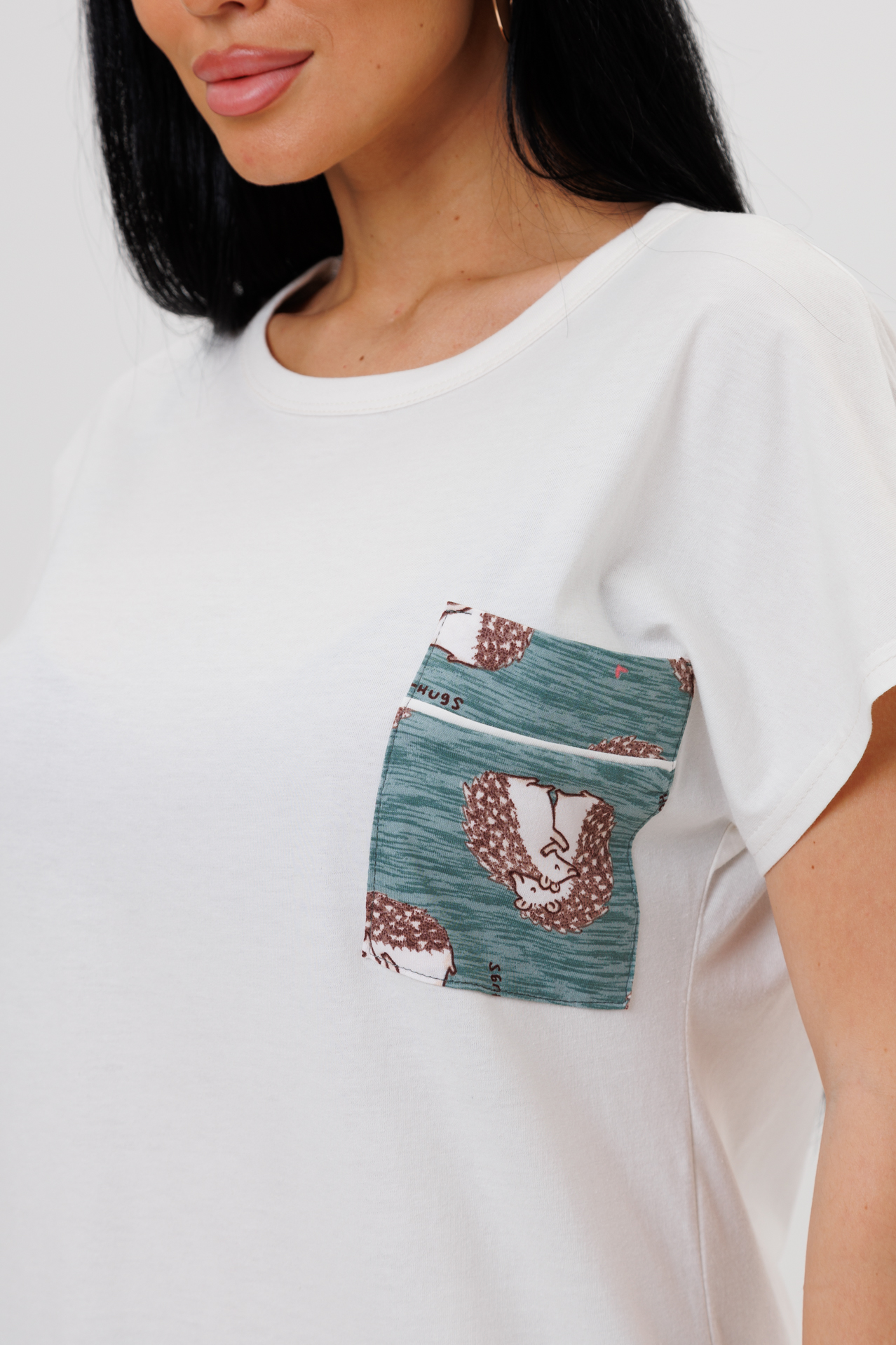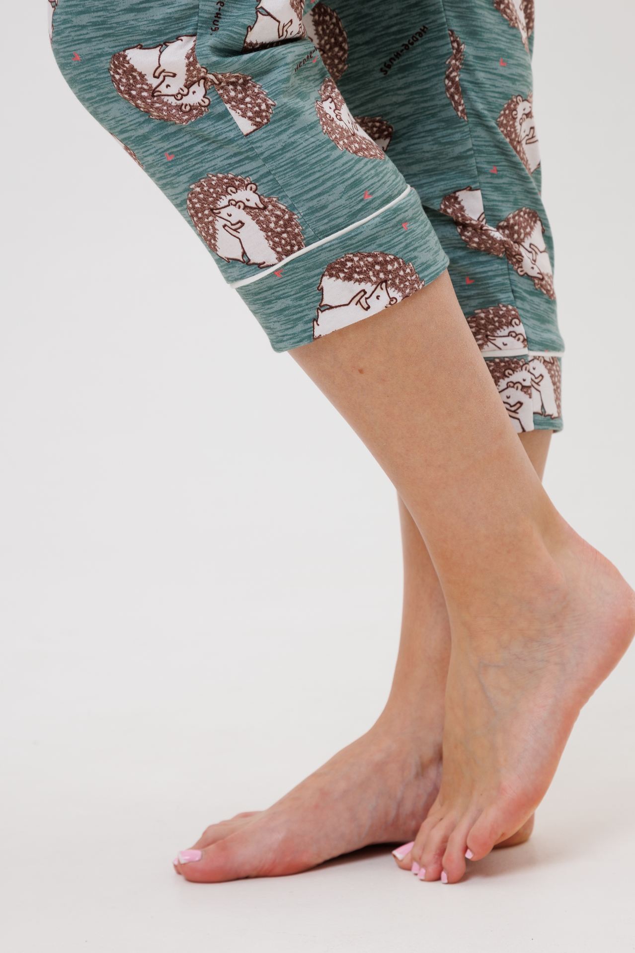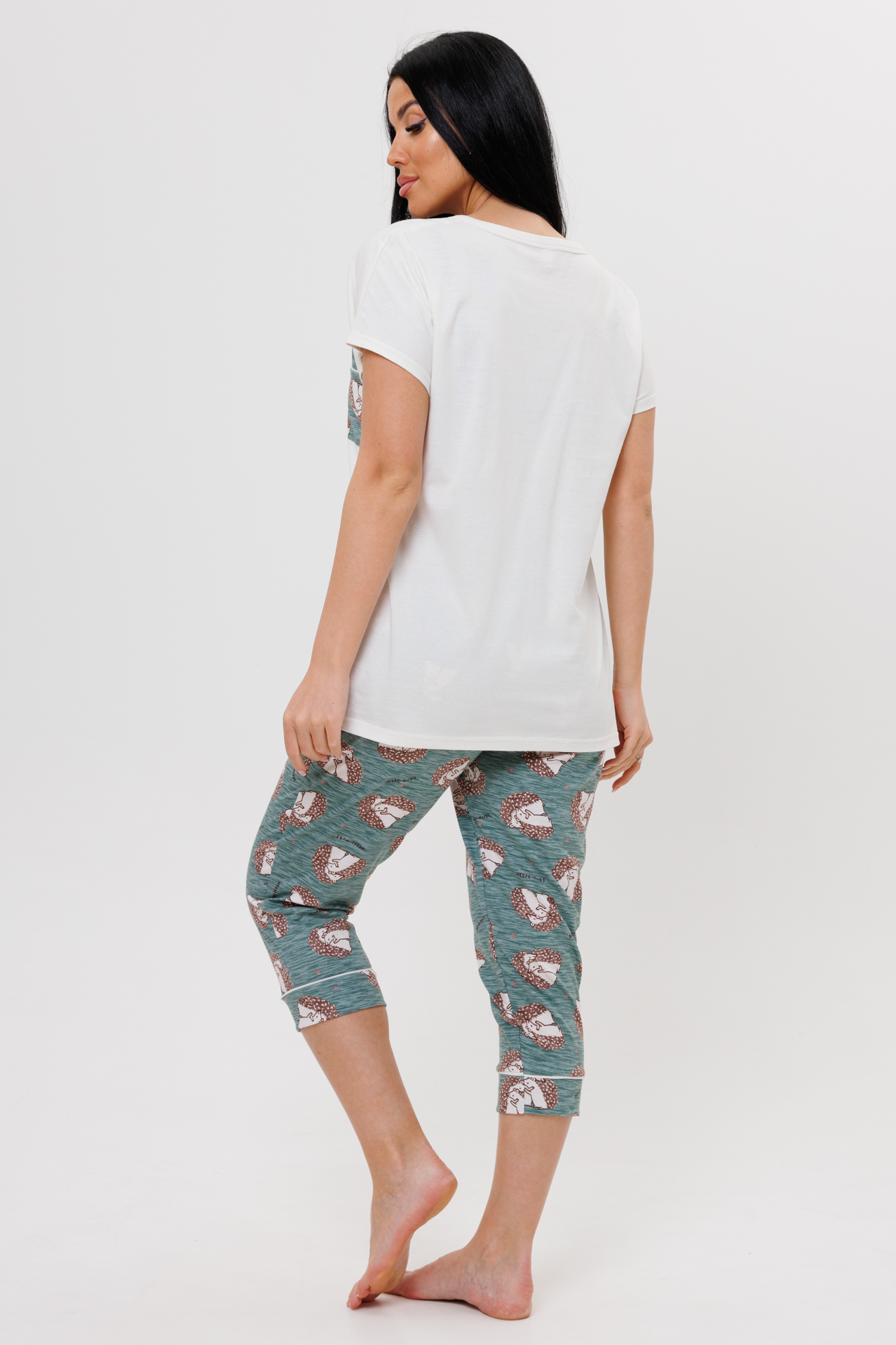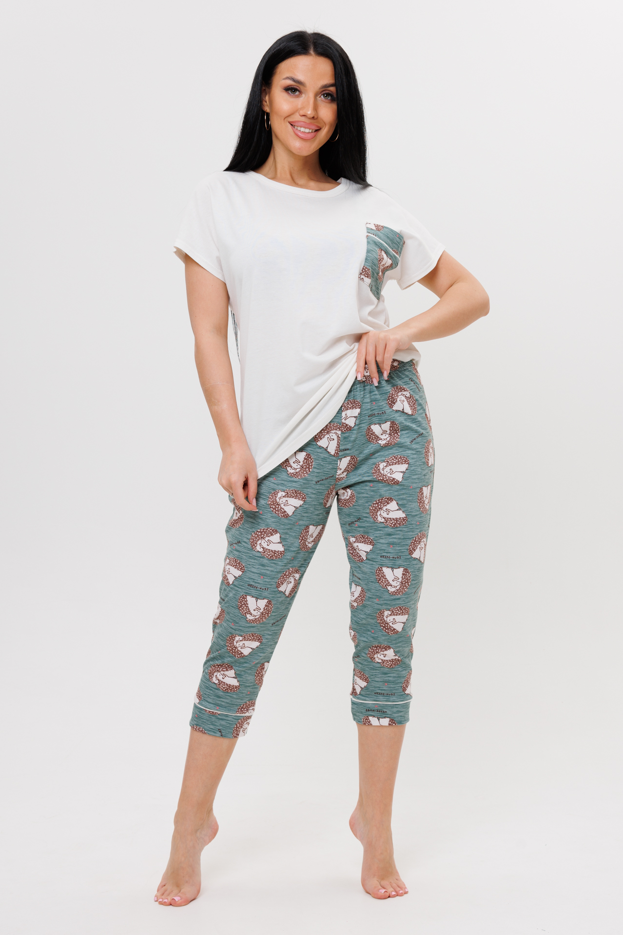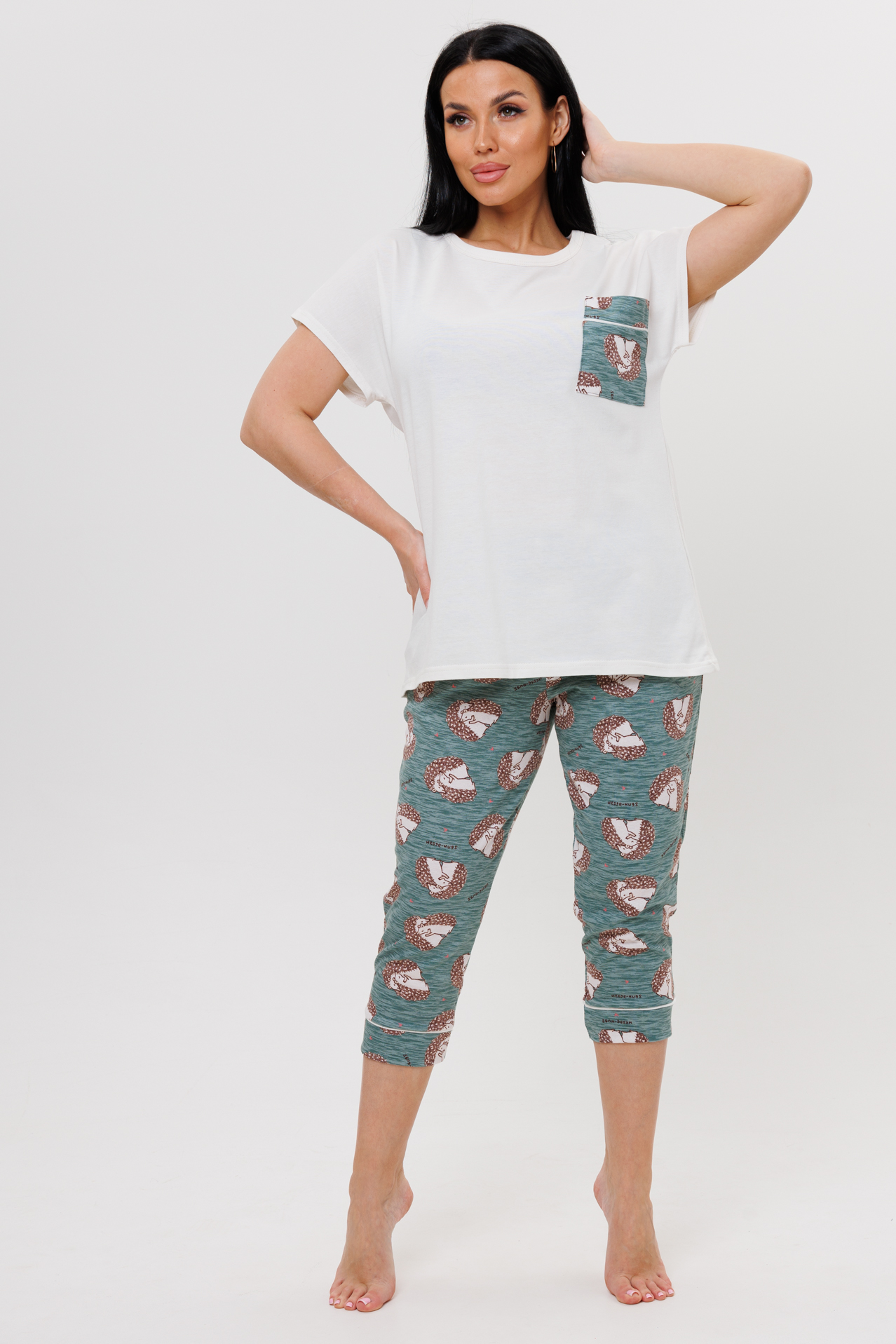 Пижама из хлопкового трикотажа - это отличный выбор для дома, отдыха и сна. Привлекательный комплект состоит из футболки и бридж. Футболка имеет округлый вырез, цельнокроеный рукав, на груди расположен карман из ткани компаньона. Бриджи с манжетами выполнены из ткани компаньона. Пижама из хлопкового трикотажа станет отличным дополнением к вашему гардеробу.