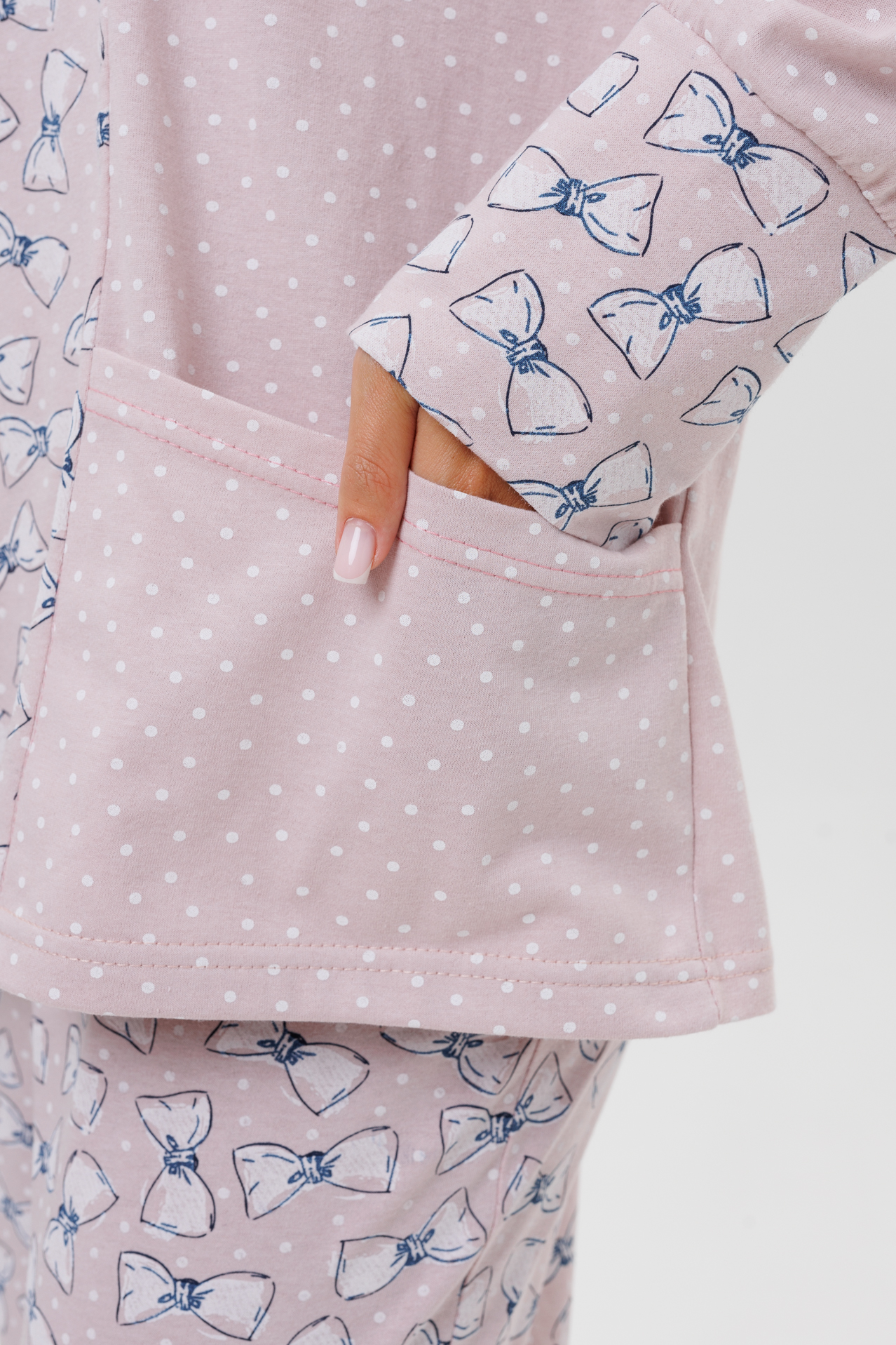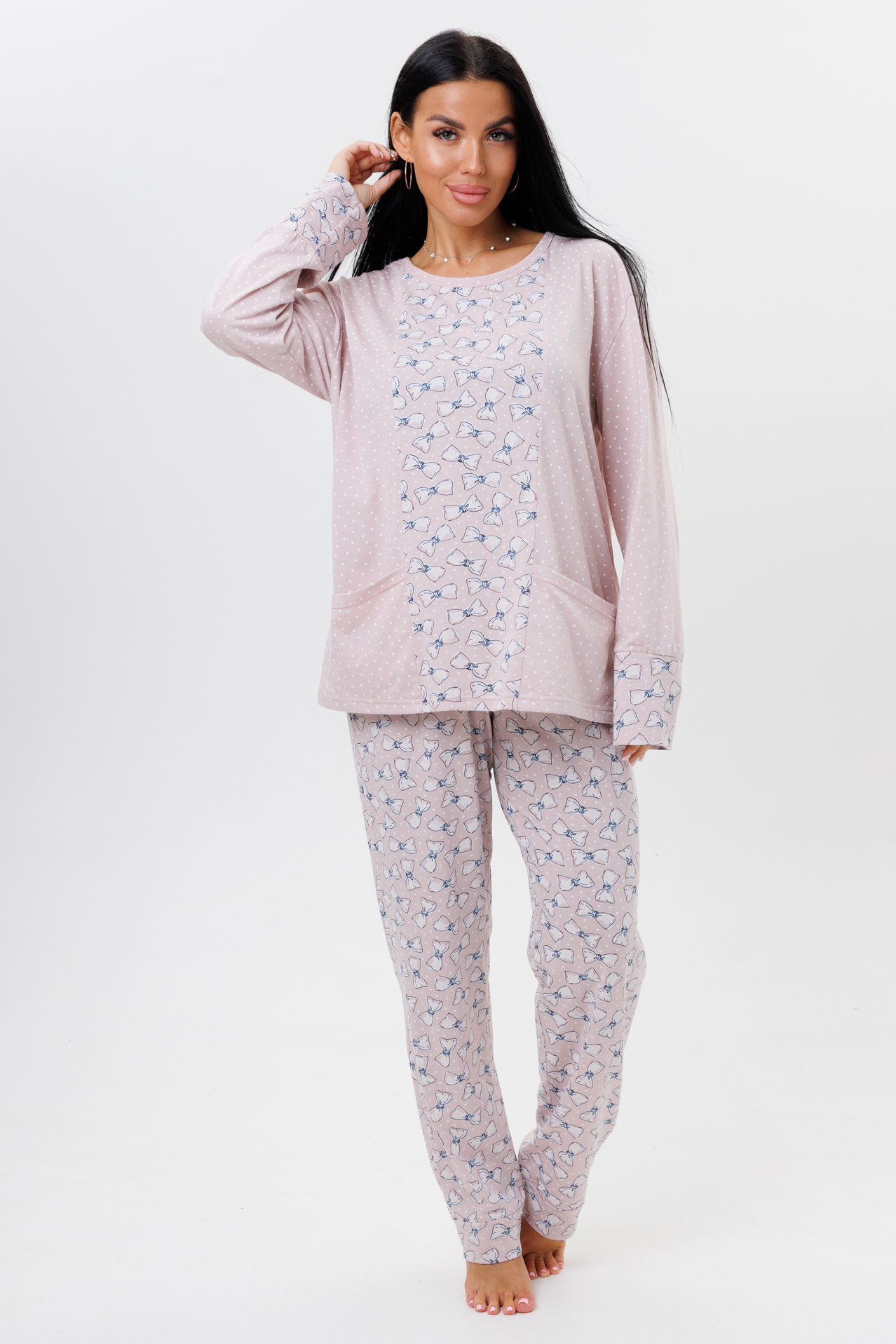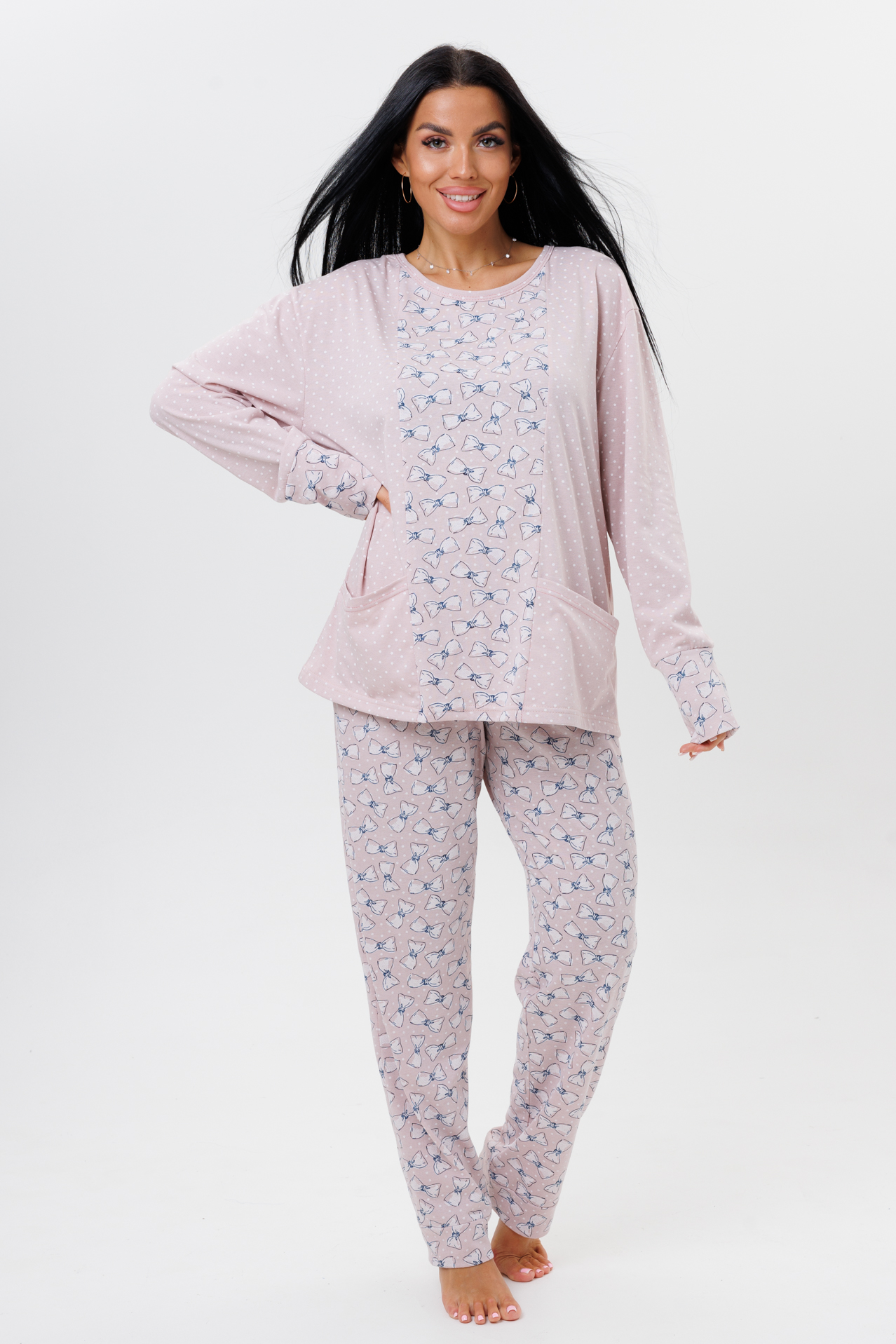 Пижама выполнена из трикотажного полотна кулирки со 100 % хлопком. Пижама состоит из кофты и брюк. Кофта с круглым вырезом, длинными рукавами с манжетами. Перед и манжеты рукава декорированы тканью компаньоном. Накладные карманы спереди входят в рельеф вставки. Брюки с манжетами на широкой резинке изготовлены из ткани компаньона.