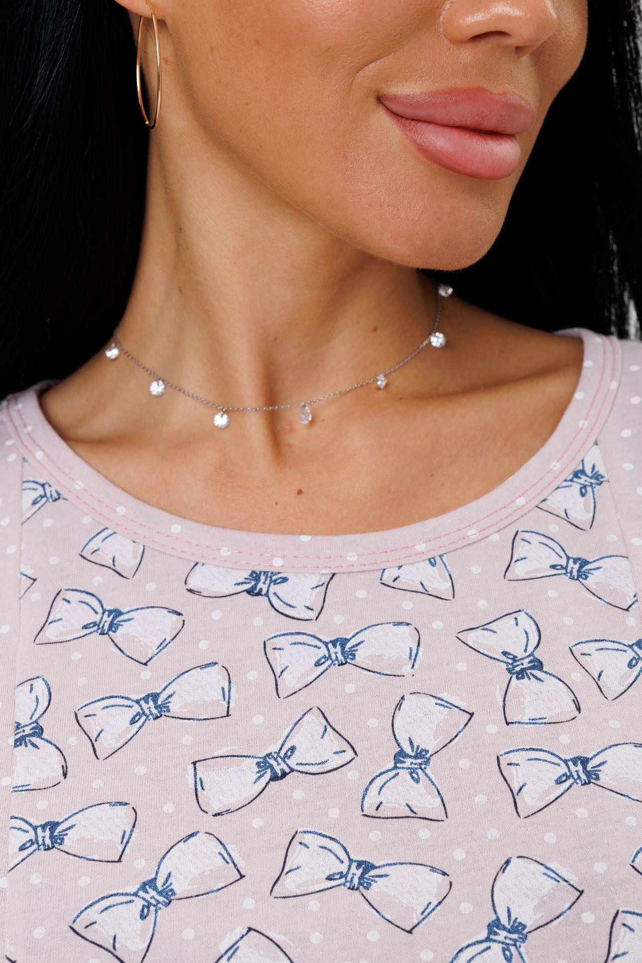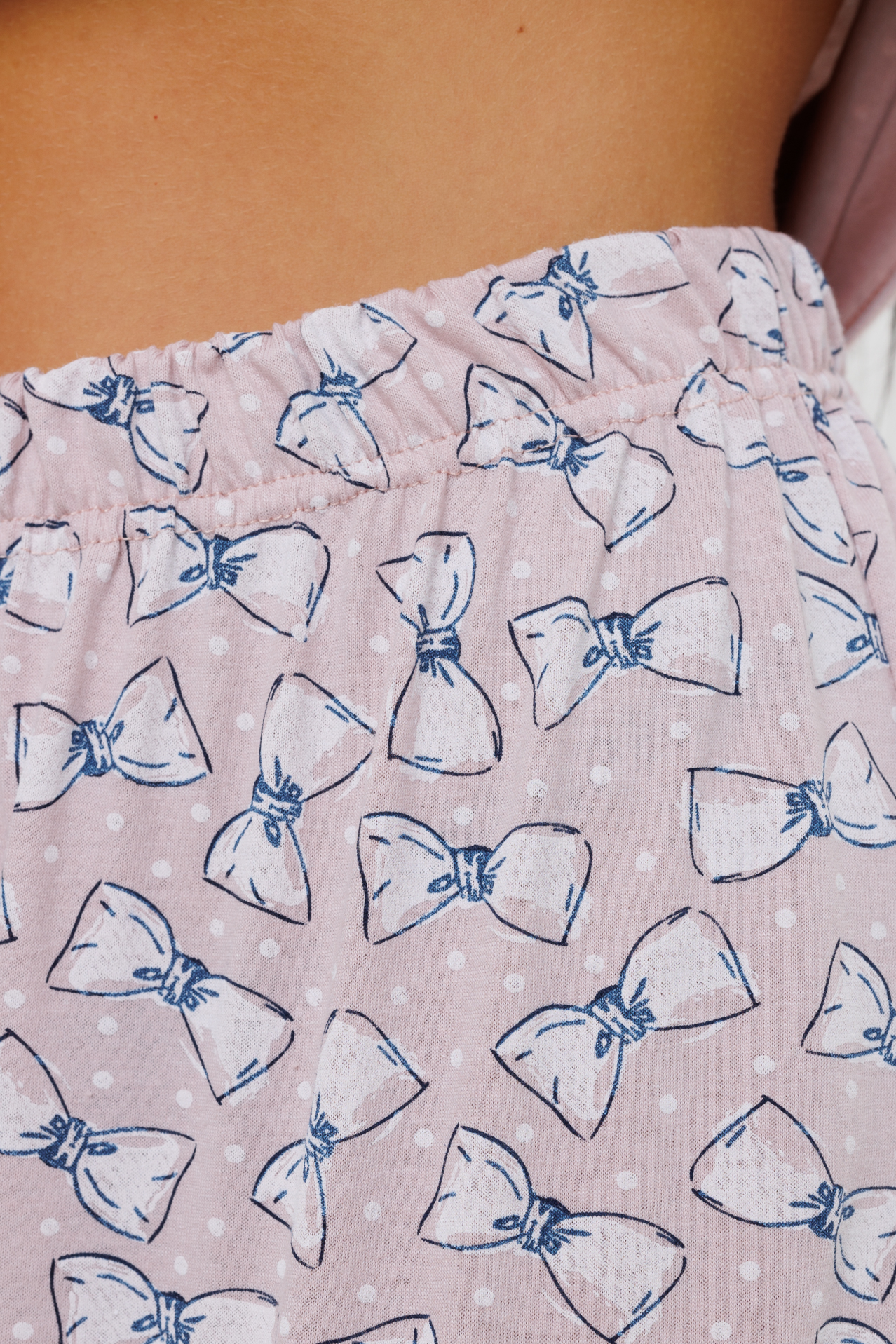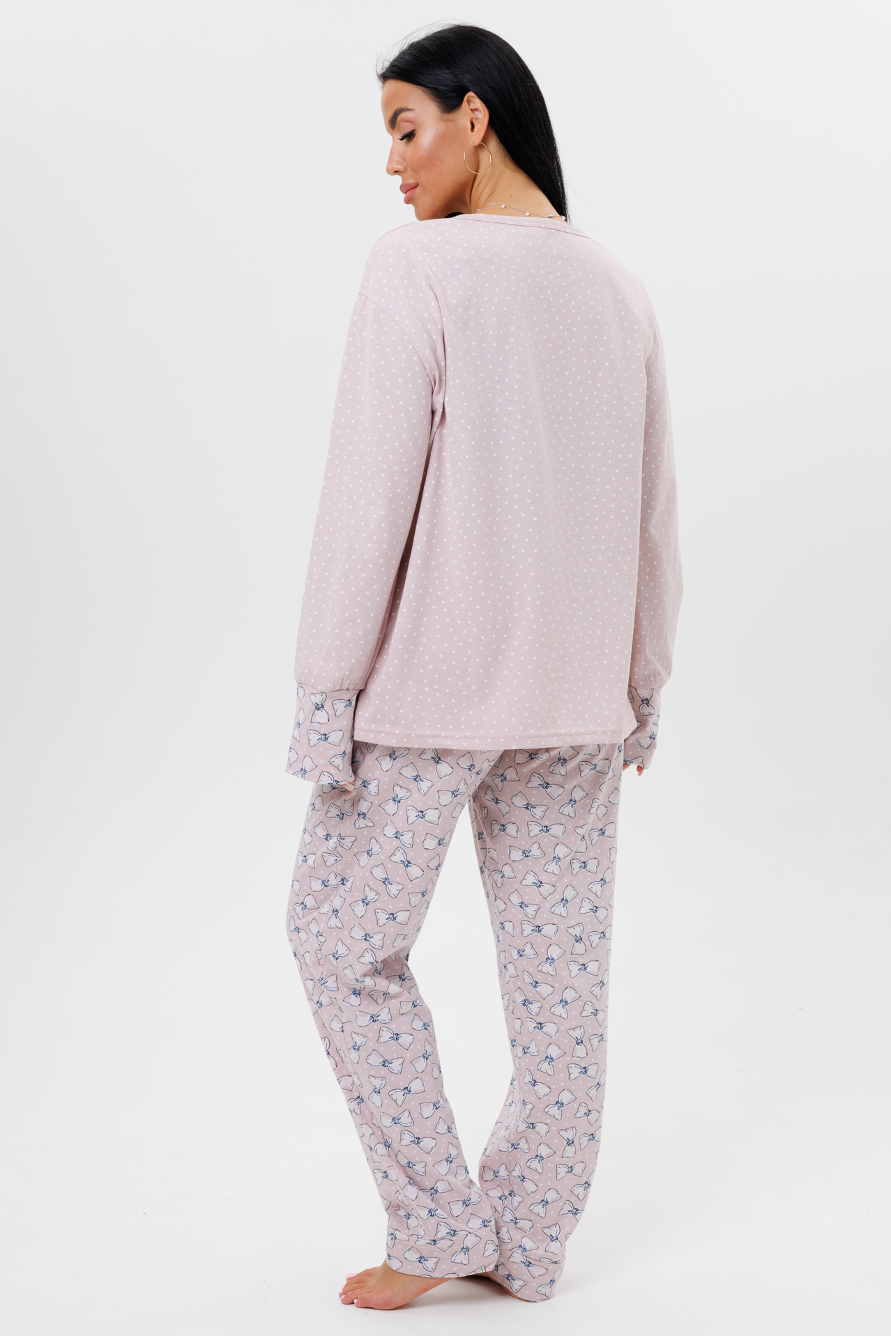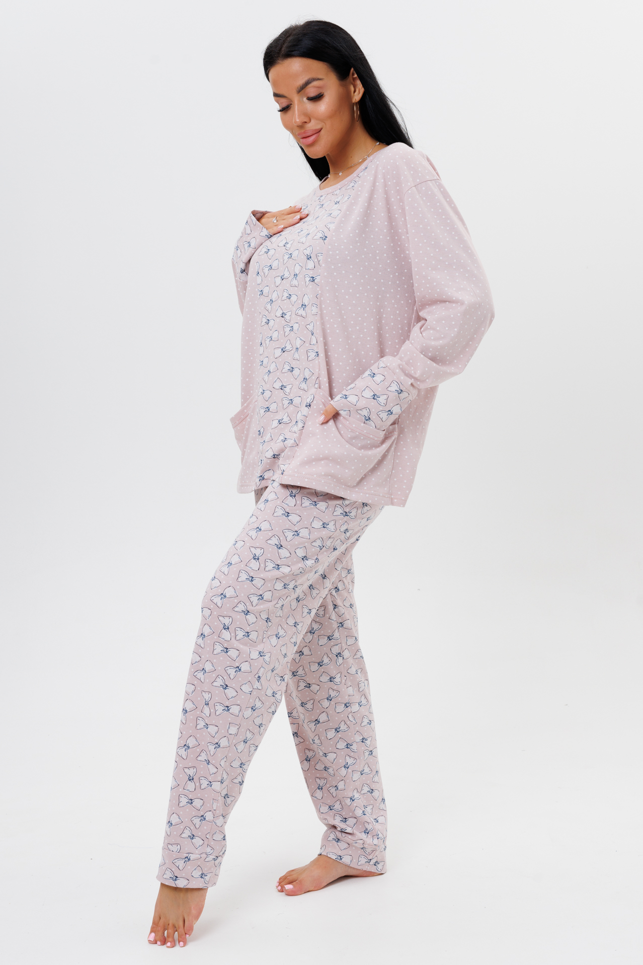 Пижама выполнена из трикотажного полотна кулирки со 100 % хлопком. Пижама состоит из кофты и брюк. Кофта с круглым вырезом, длинными рукавами с манжетами. Перед и манжеты рукава декорированы тканью компаньоном. Накладные карманы спереди входят в рельеф вставки. Брюки с манжетами на широкой резинке изготовлены из ткани компаньона.