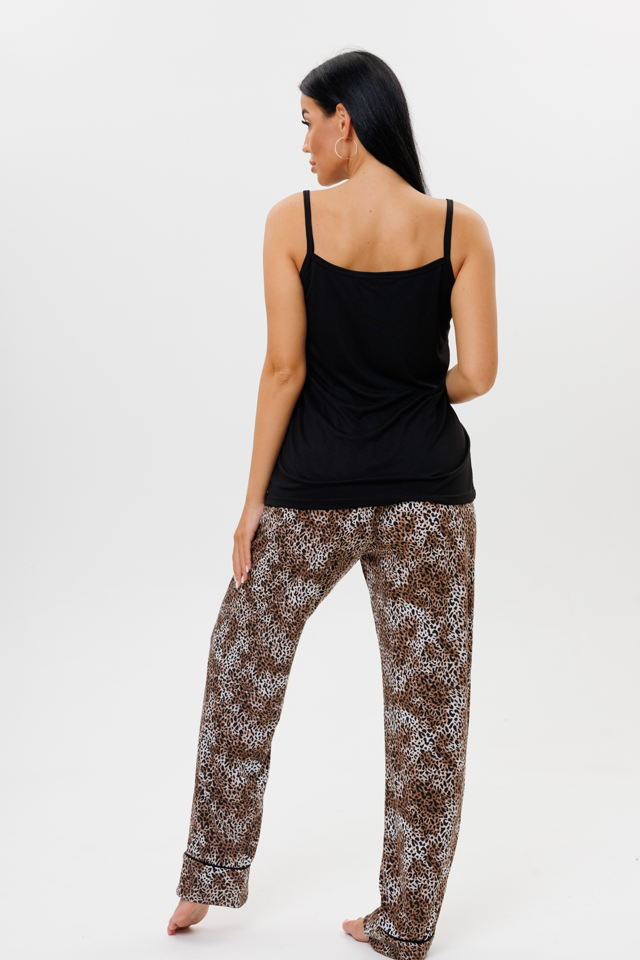 Пижамный комплект из вискозы состоит из однотонного топа на узких бретельках и брюк с анималистическим принтом на резинке. Изящество брюк подчеркивают оригинальные манжеты, окантованные однотонной тканью.
