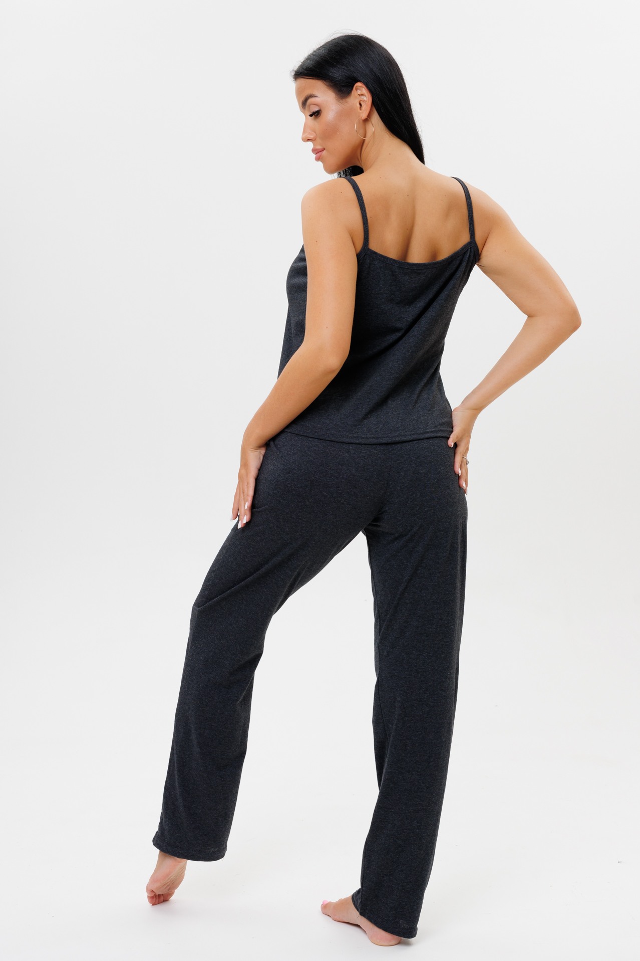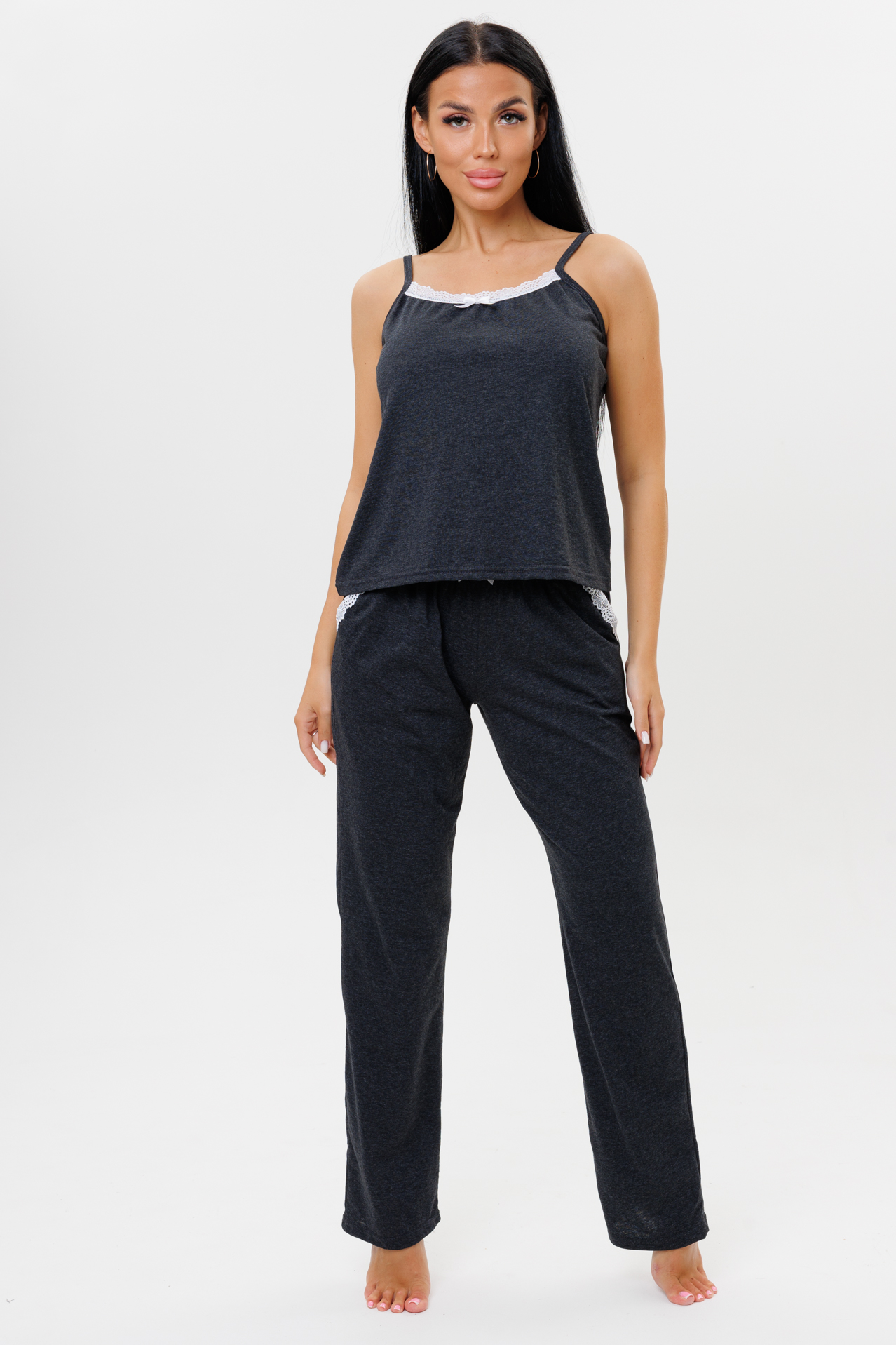 Пижама сшита из трикотажного полотна кулирки с содержанием 50 % хлопка. Пижама состоит из топа и брюк. Топ на тонких лямках отделан по линии выреза кружевом с бантом. Брюки прямого кроя на широкой резинке с бантом дополнены по бокам карманами, которые декорированы кружевом.