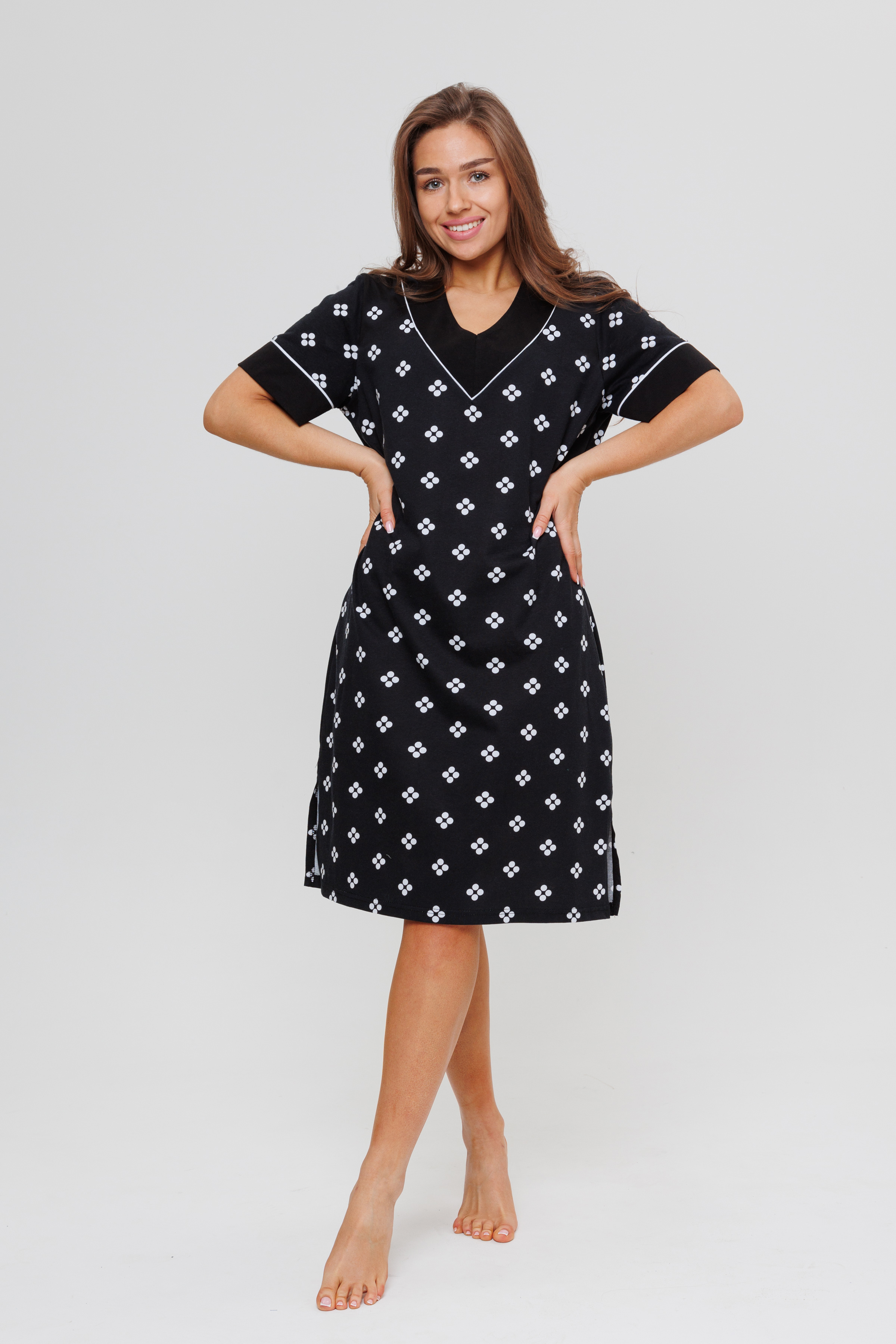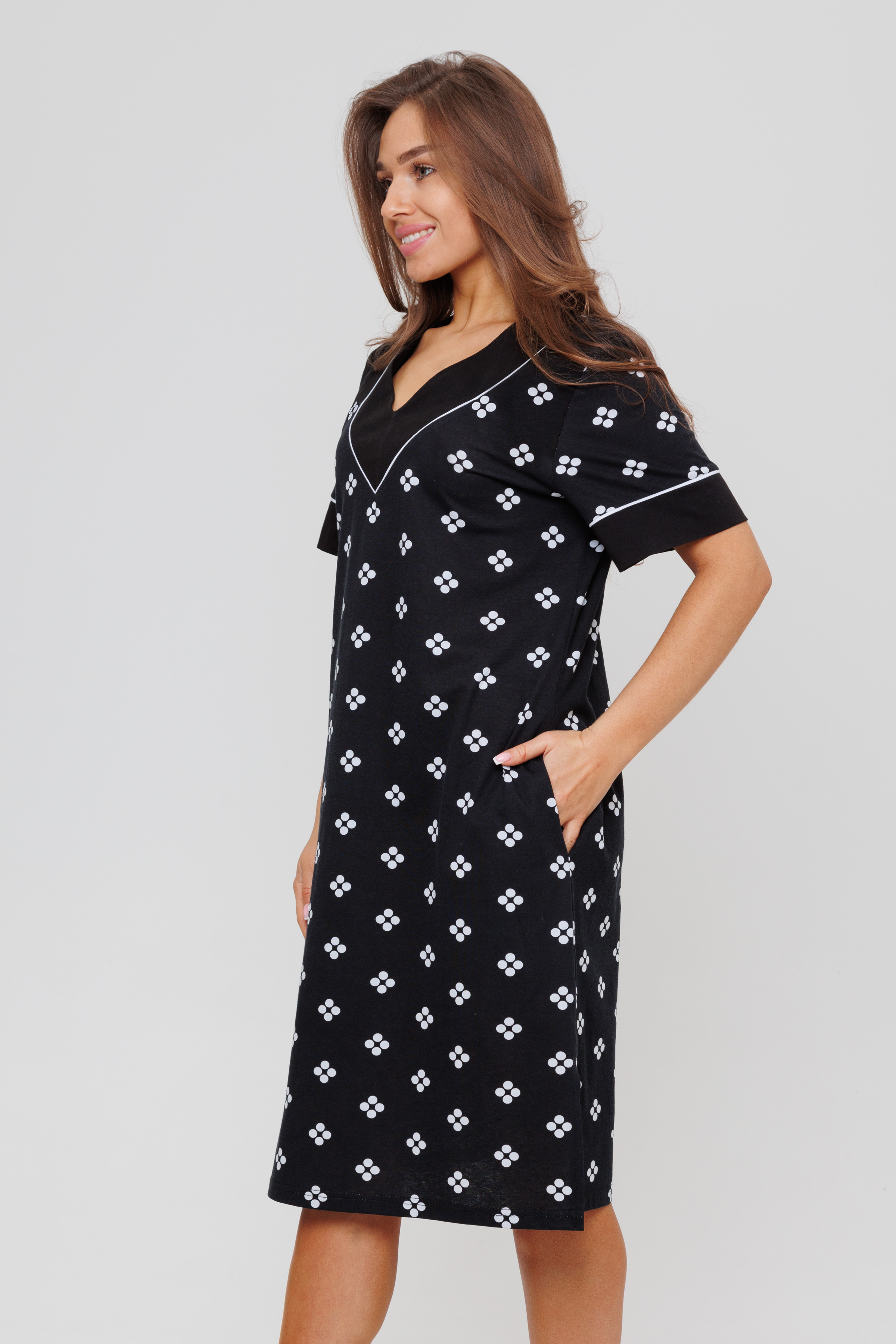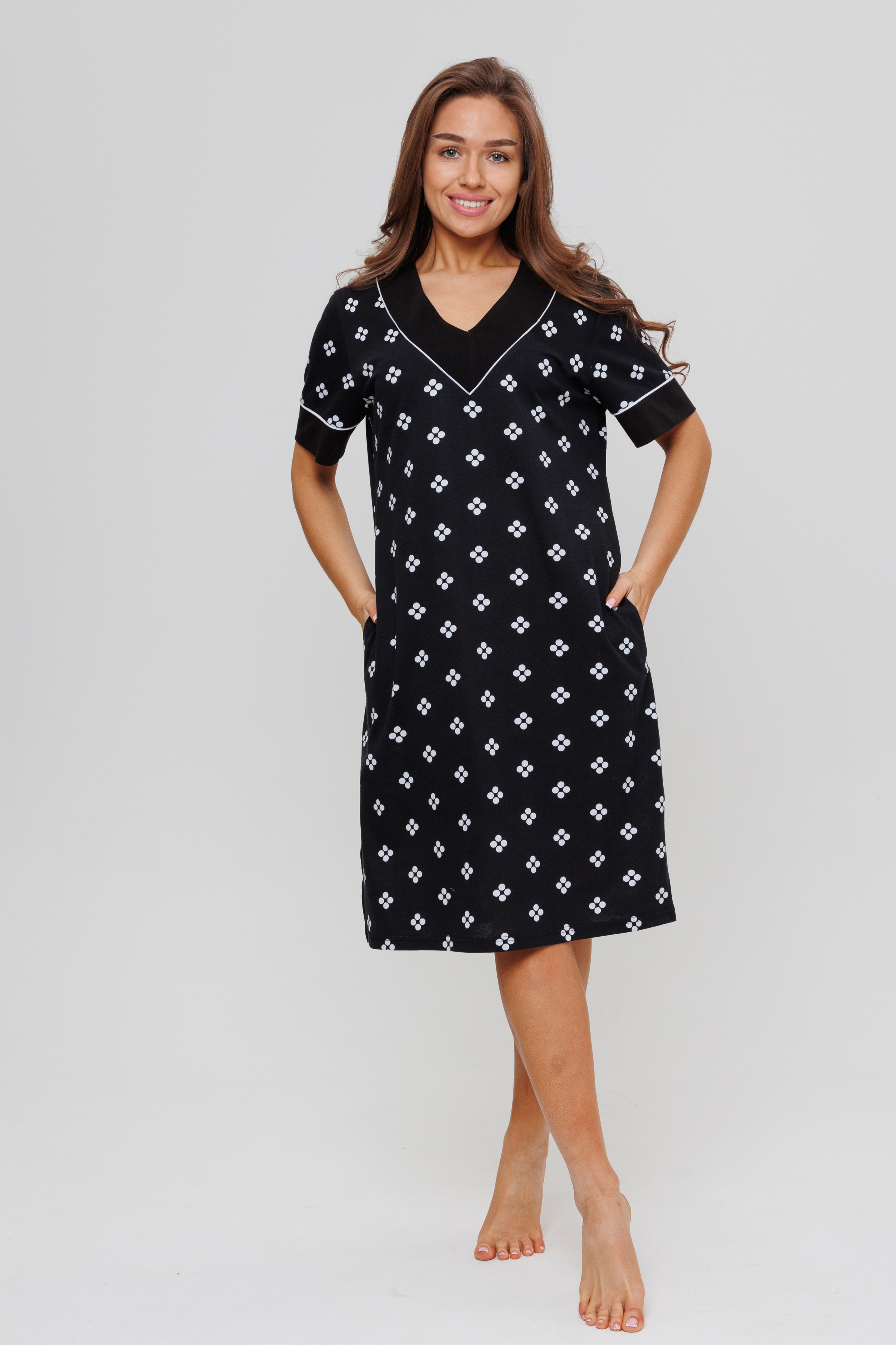 Туника домашняя их кулирки. V-образный вырез горловины обработан планкой и контрастным каентом. Длина - до середины колена. Карманы в боковых швах