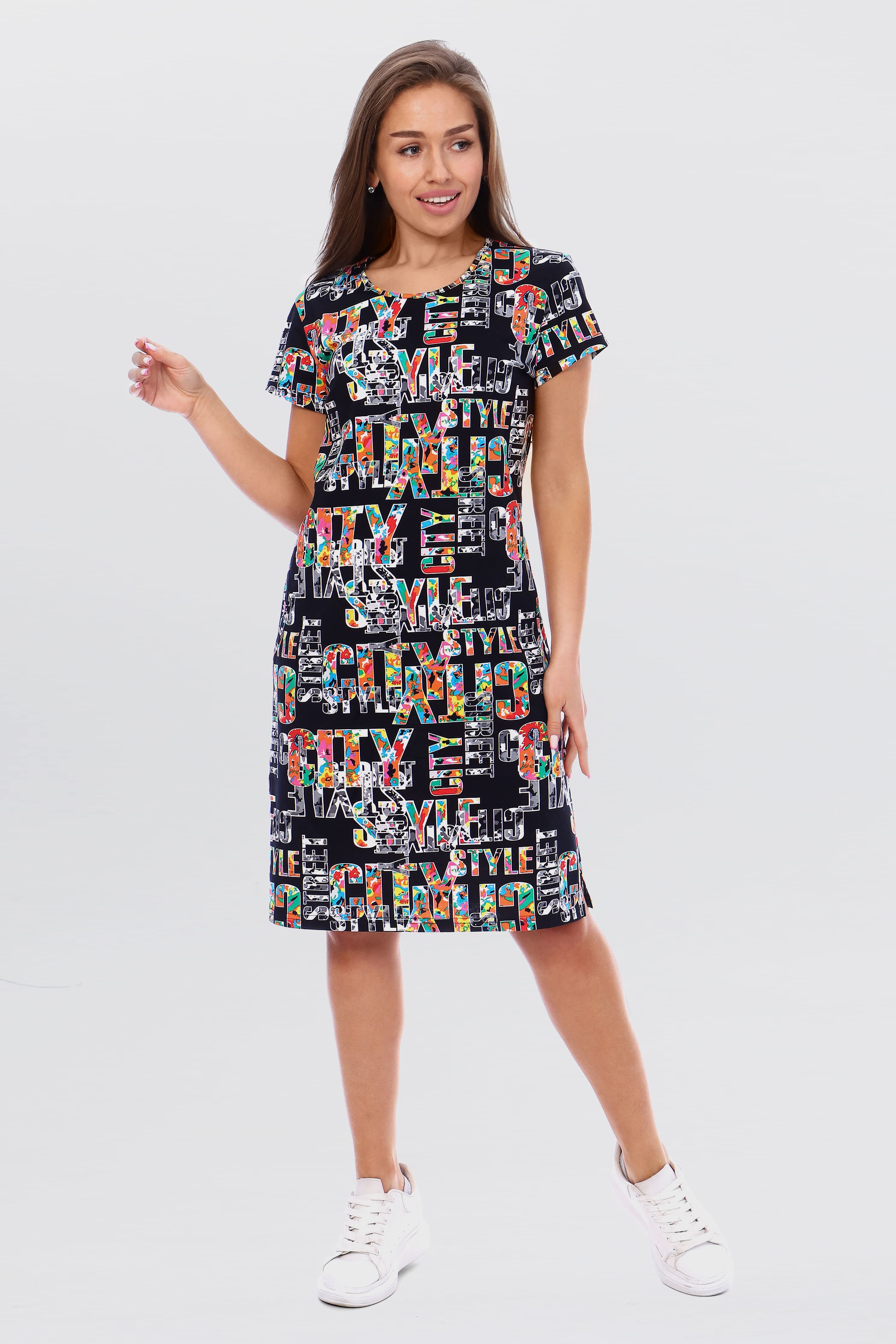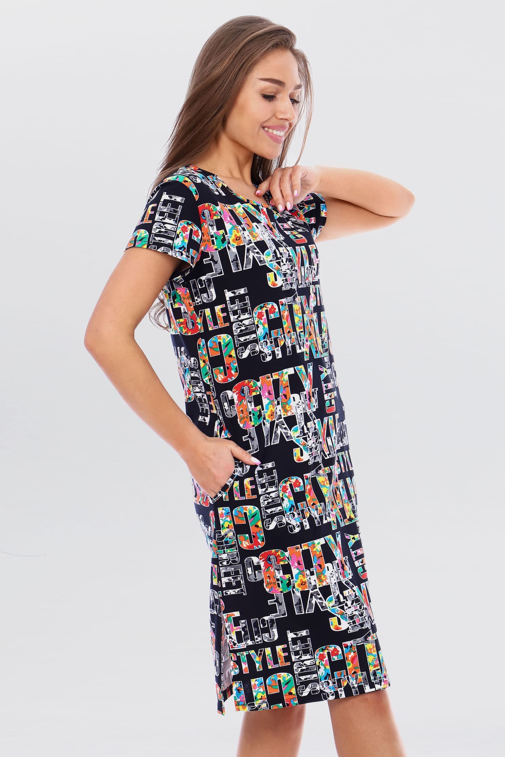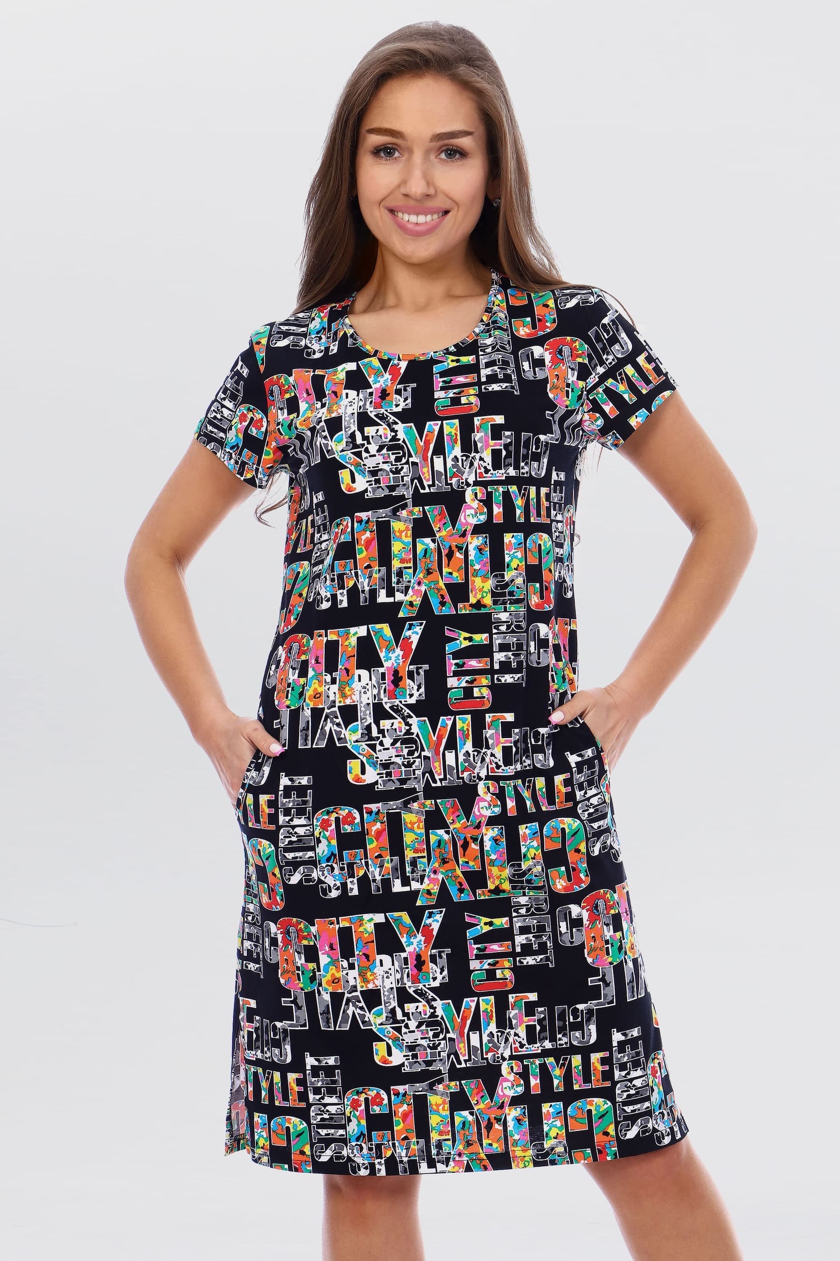 Яркая летняя туника из кулирки с коротким рукавом. Длина - до колена. В боковых швах карманы