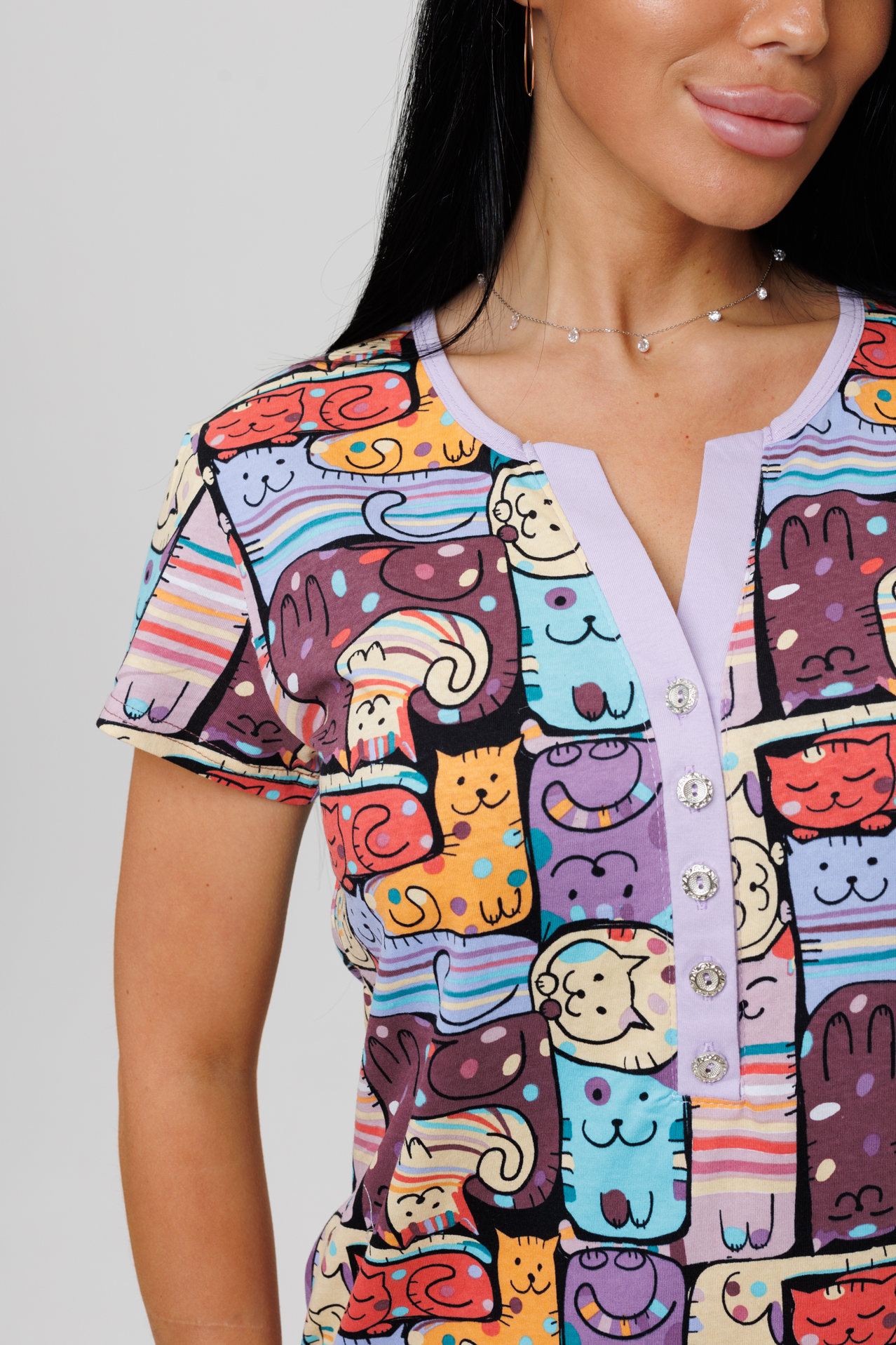 Туника сшита из трикотажного хлопкового полотна кулирки. Вырез V-образный, короткий втачной рукав, планка передней части туники выполнена из ткани компаньона, декорированная пуговицами. Оригинальность тунике прибают боковые карманы и разрезы.