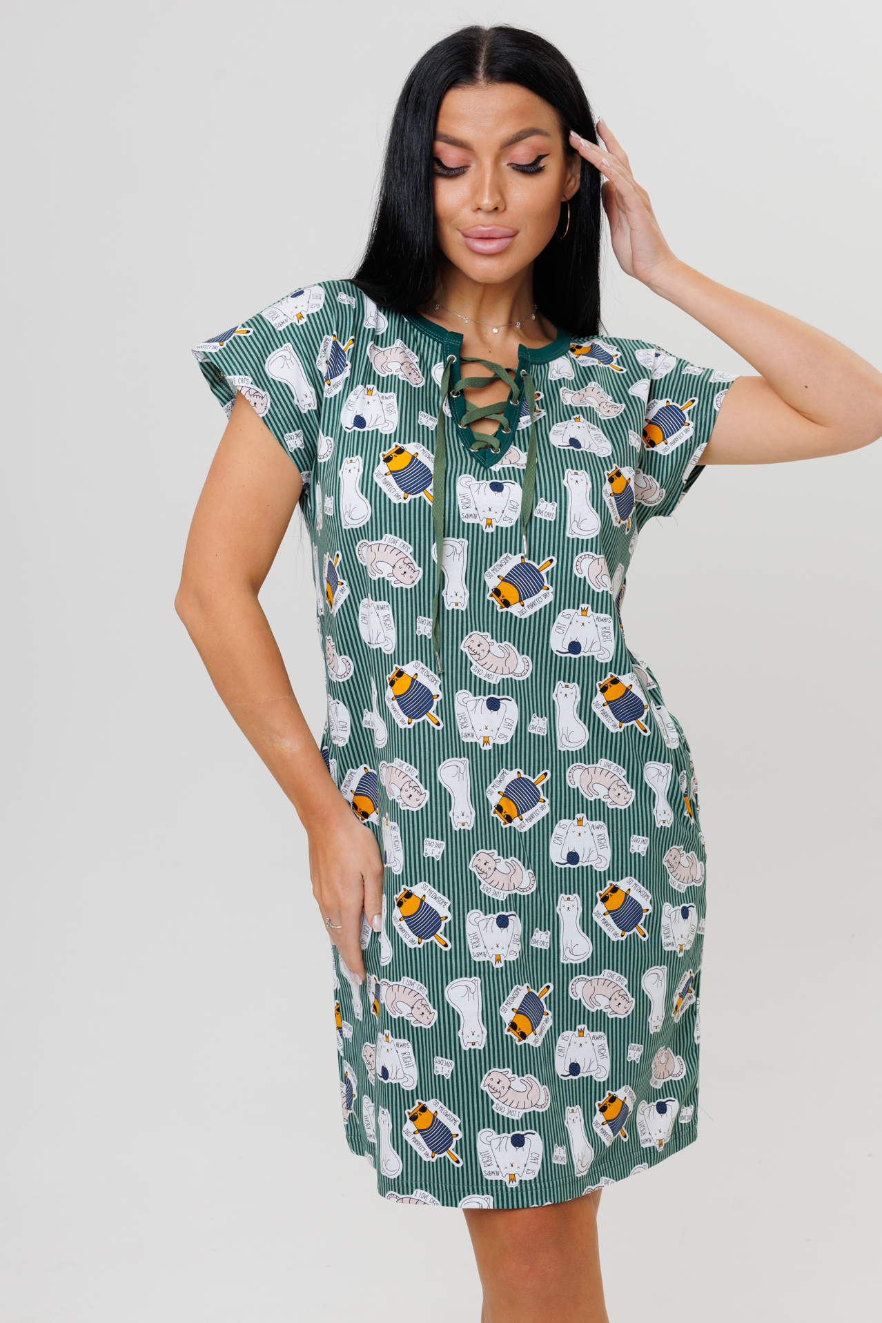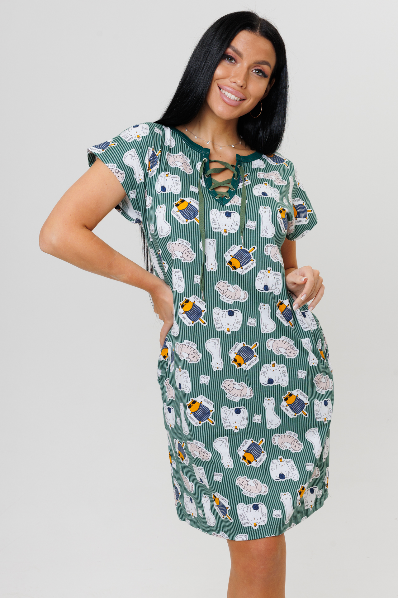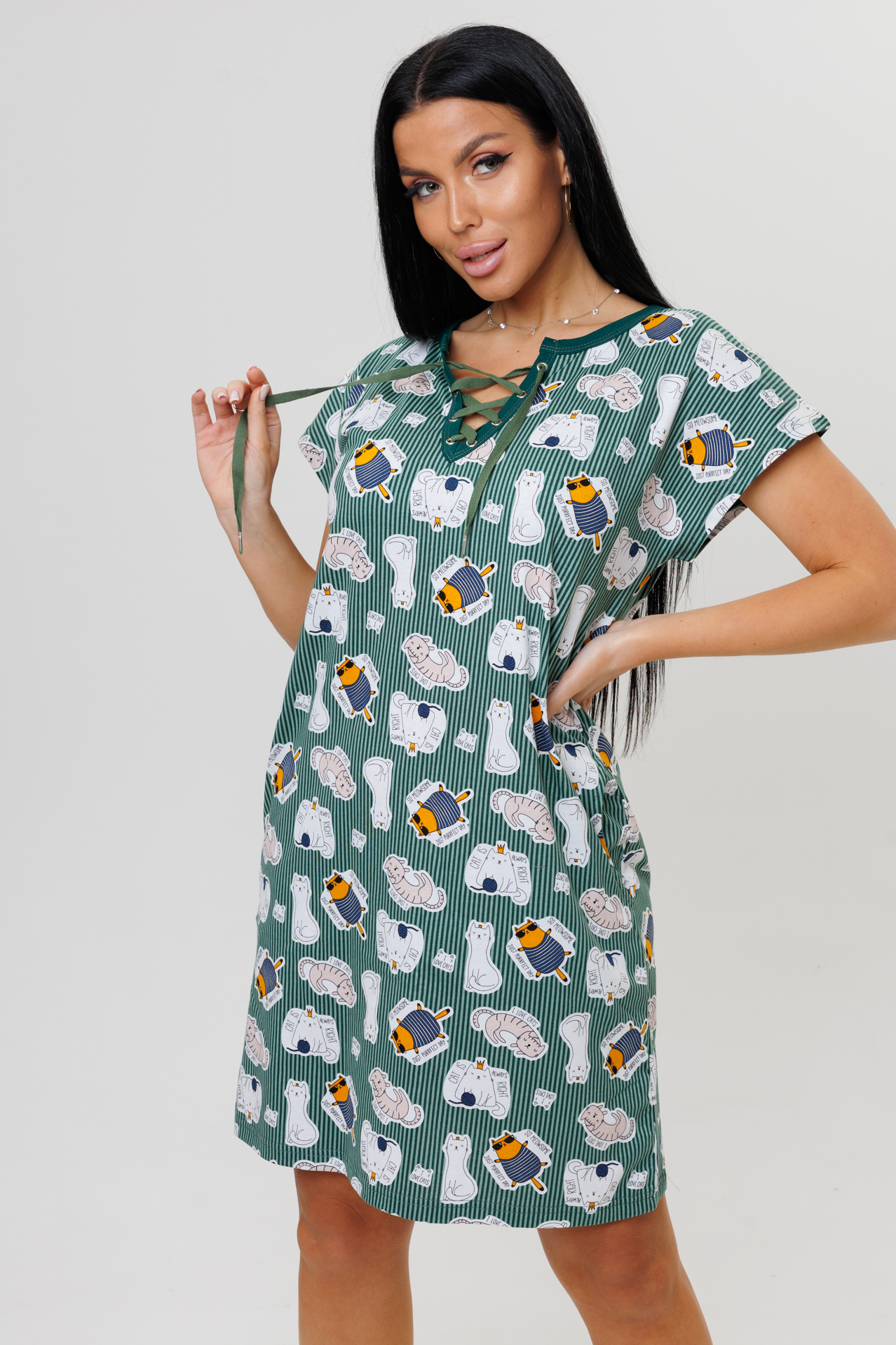 Туника из хлопкового трикотажного полотна - идеальное решение для дома и отдыха. Женственность тунике придают V-образный вырез с декоративной шнуровкой и карманы в боковых швах.