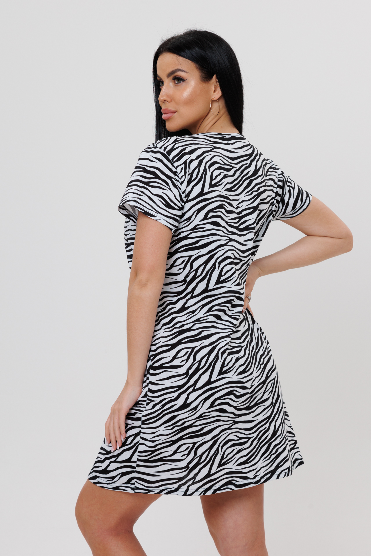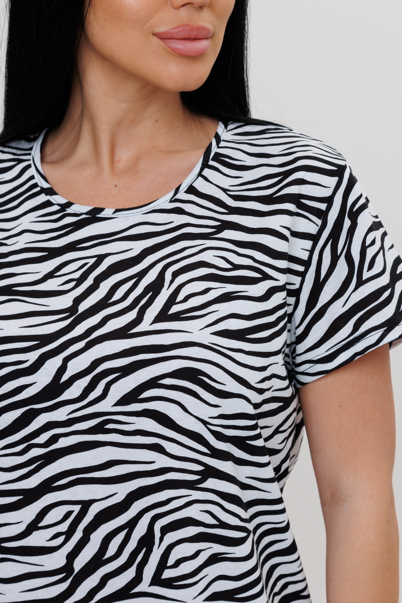 Легкая трикотажная туника с анималистическим принтом - воплощение изысканности и непринужденности. Туника выполнена из трикотажного полотна 100% хлопка. Свободная летняя туника с коротким рукавом не стесняет движений. Круглый вырез подчеркивает контуры лица. Ее легко стилизовать разной обувью и аксессуарами, создавая различные образы. Она также будет актуальна и как легкое домашнее платье.