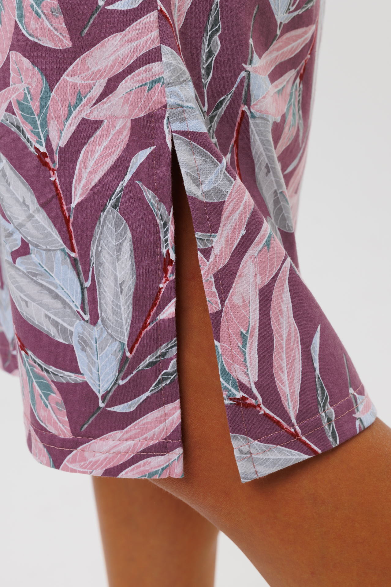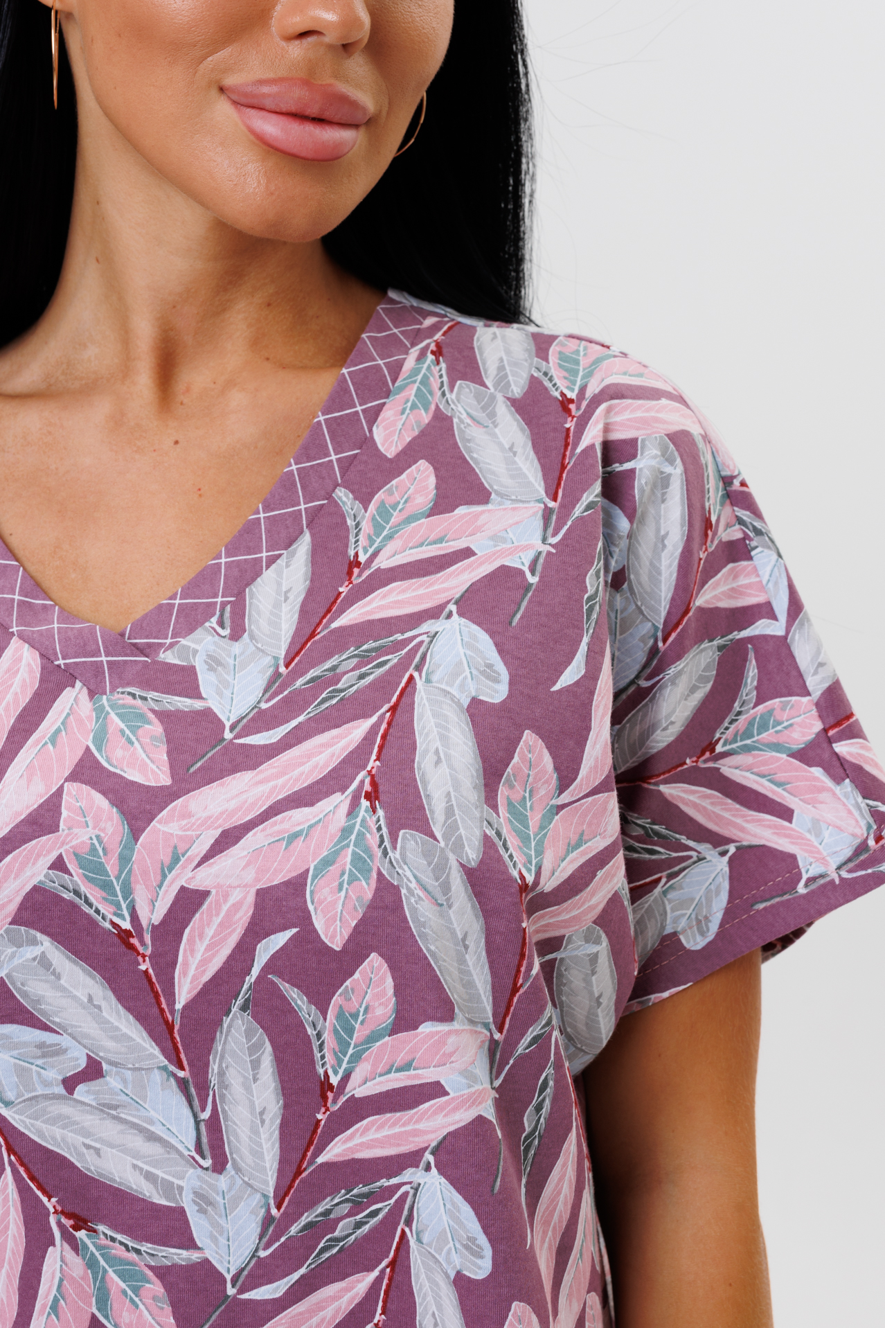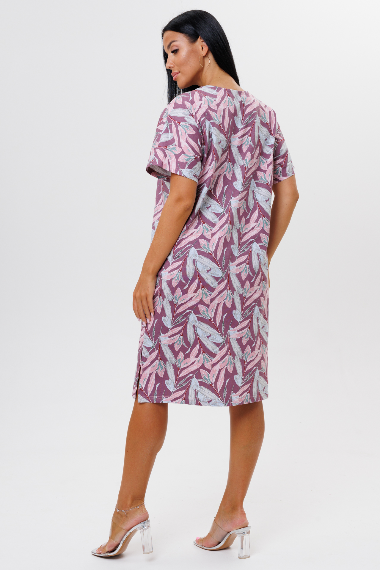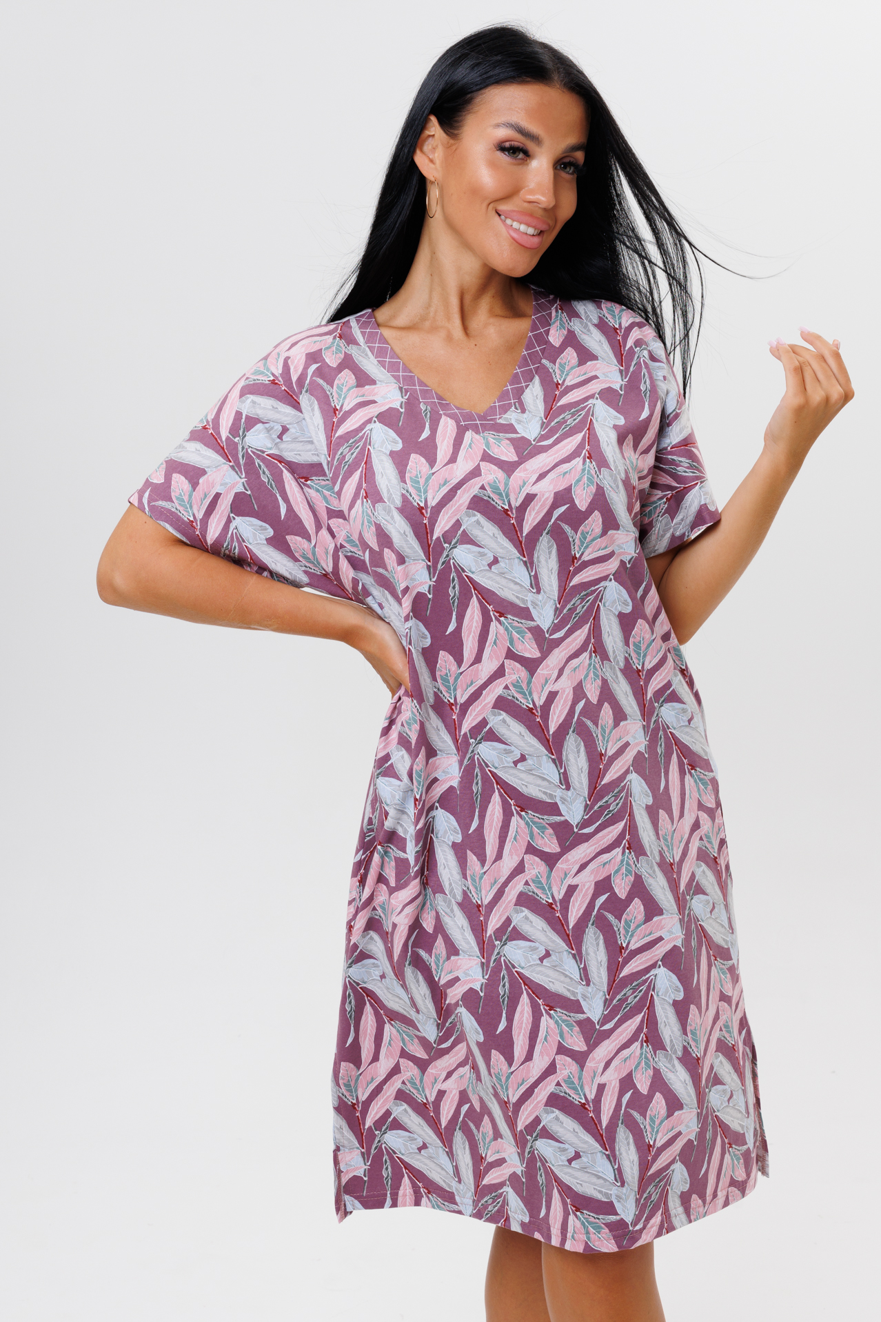 Туника свободного кроя выполнена из кулирки. V-образный вырез отделан тканью компаньоном. Длина чуть ниже колена. Короткий рукав слегка спущен. По бокам карманы и разрезы.