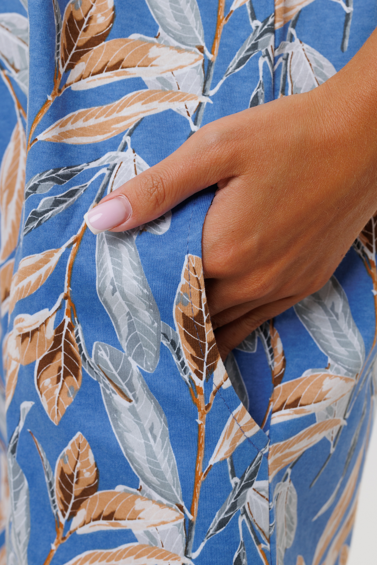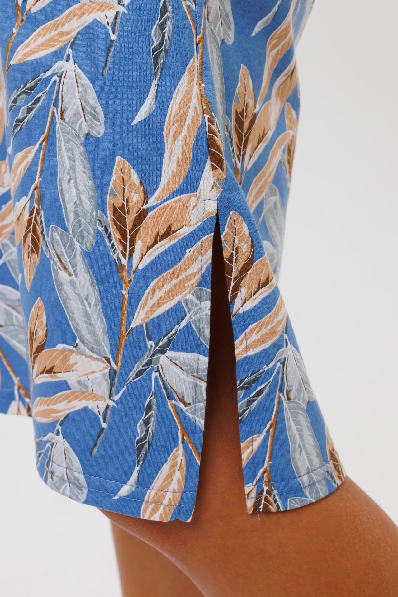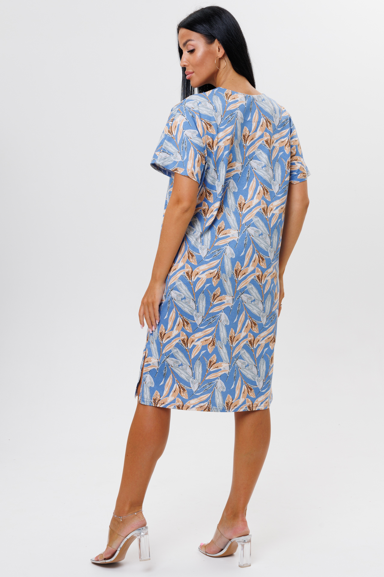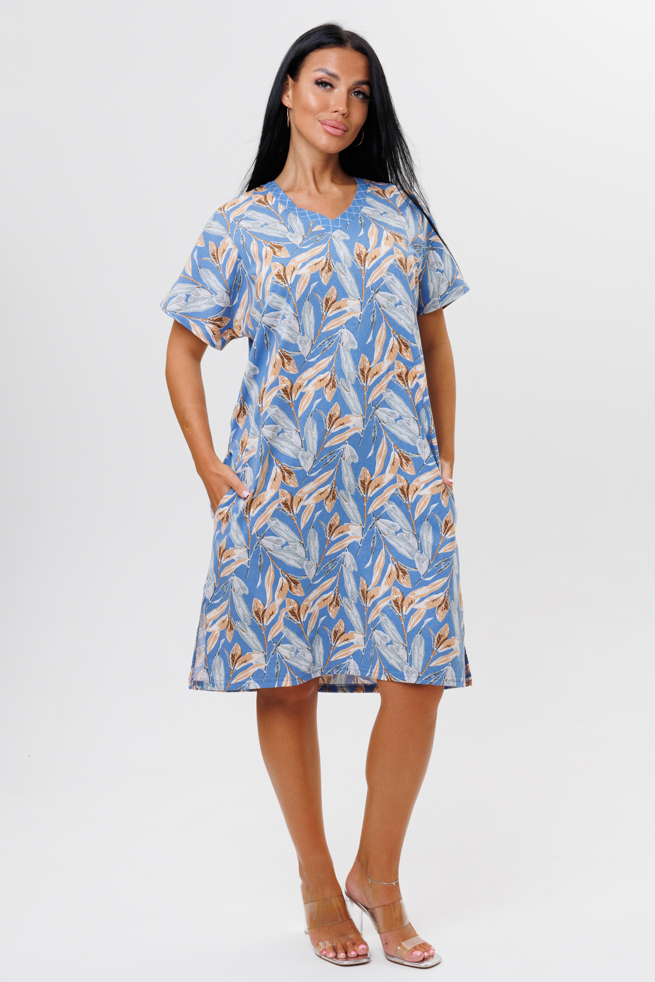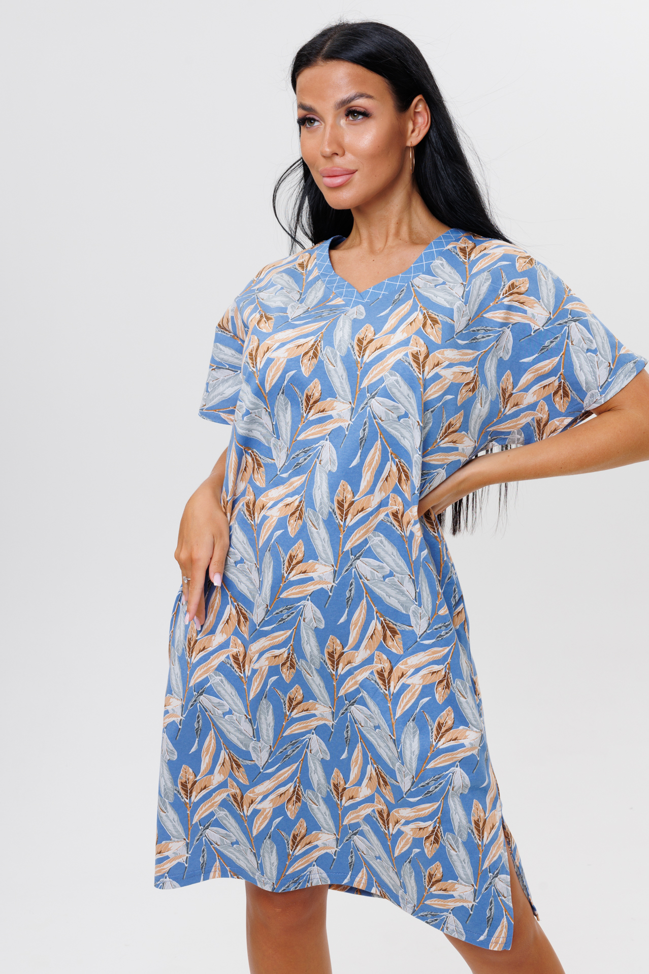 Туника свободного кроя выполнена из кулирки. V-образный вырез отделан тканью компаньоном. Длина чуть ниже колена. Короткий рукав слегка спущен. По бокам карманы и разрезы.