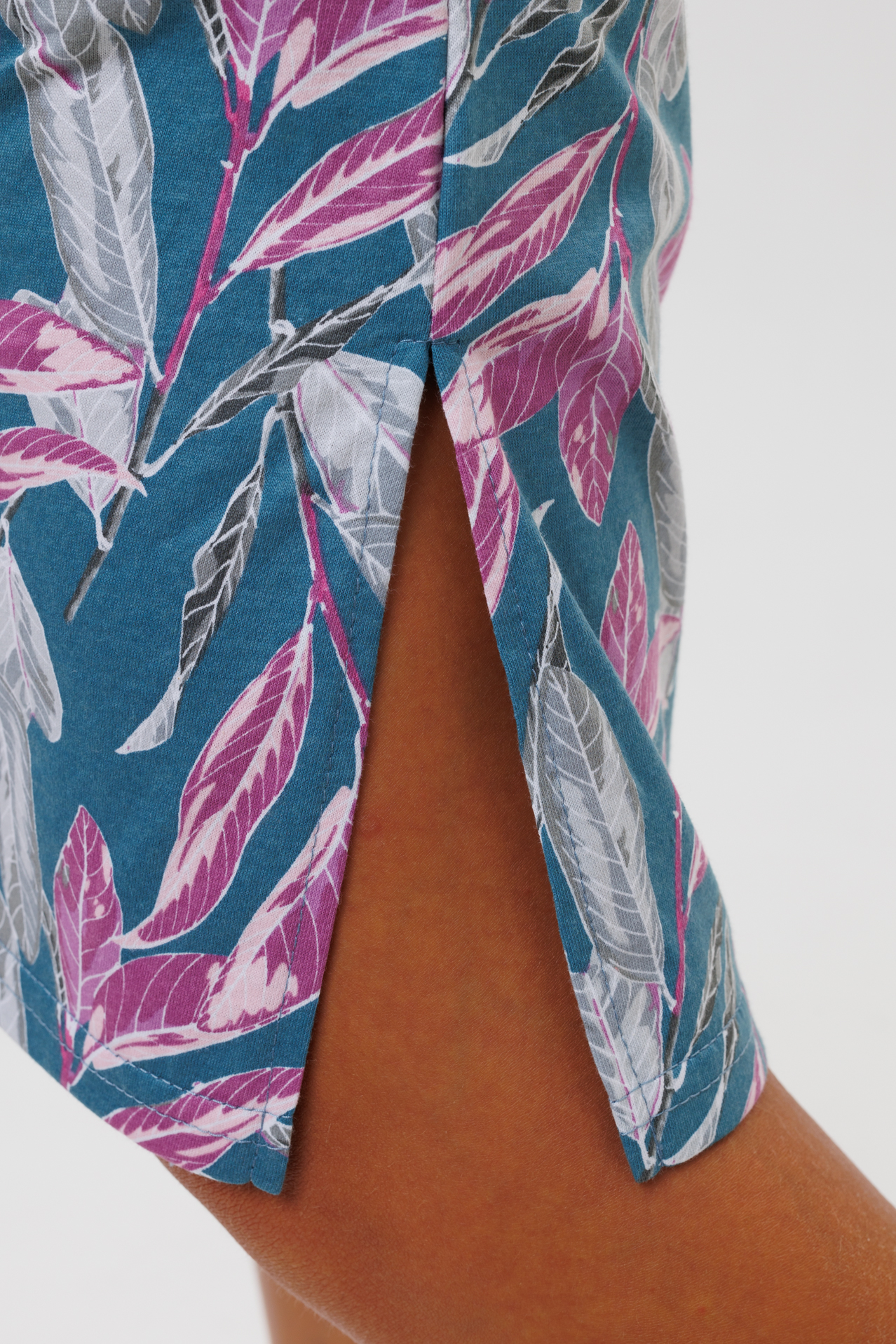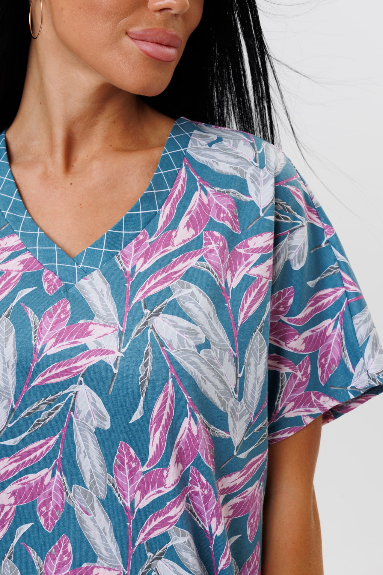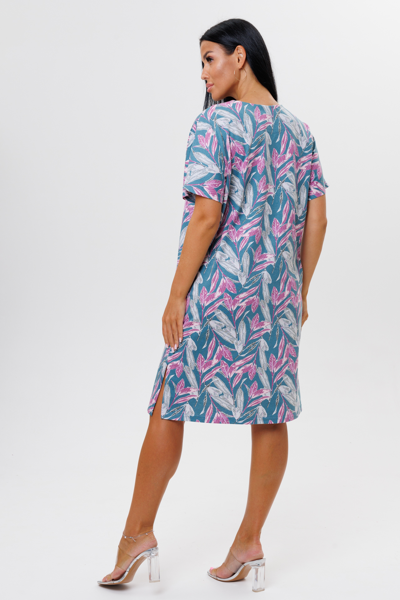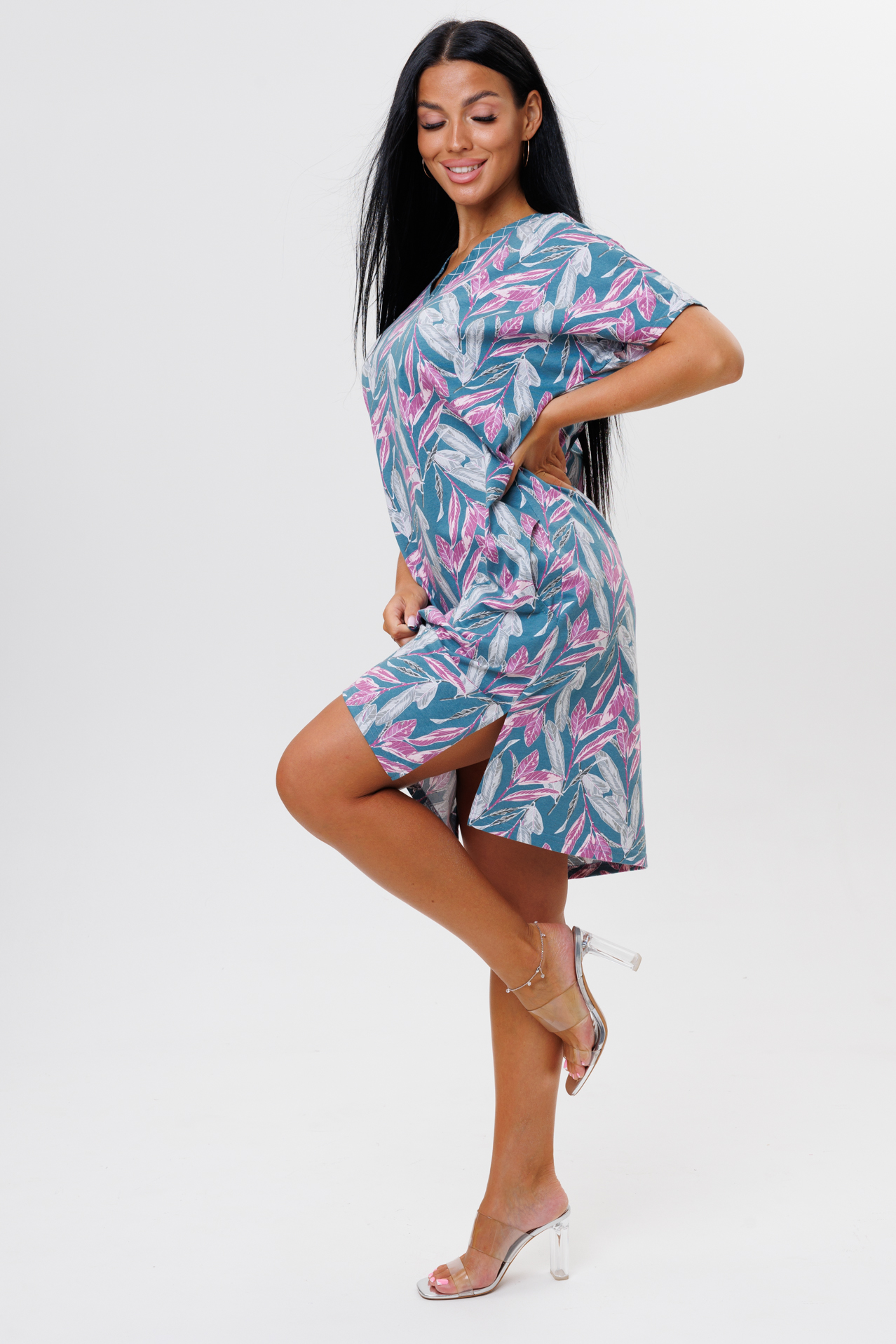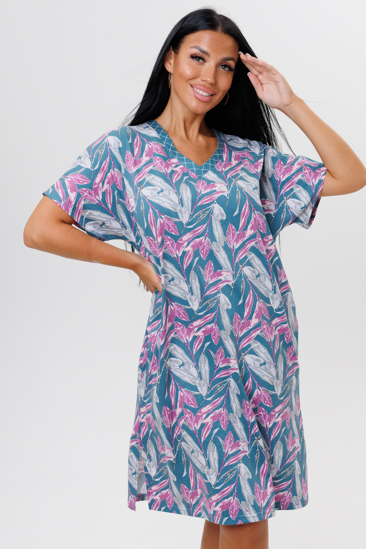 Туника свободного кроя выполнена из кулирки. V-образный вырез отделан тканью компаньоном. Длина чуть ниже колена. Короткий рукав слегка спущен. По бокам карманы и разрезы.
